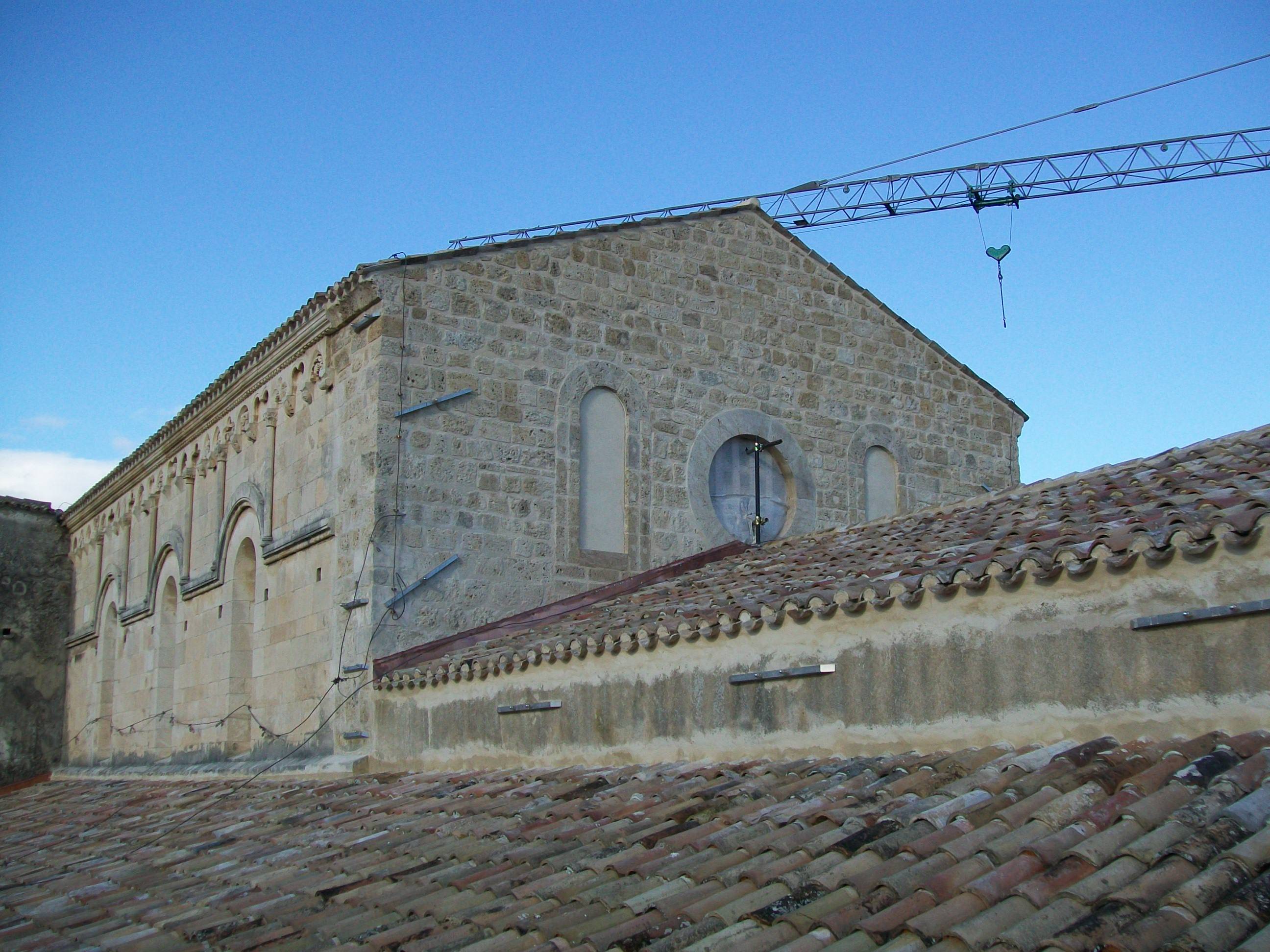 Il crollo del muro di timpano posteriore aveva creato una situazione di grave instabilità con brani di muratura ancora pericolanti, che facevano temere la successione di ulteriori e rovinosi crolli. Il cantonale del muro di timpano si trovava in equilibrio precario, com’era, separato dalla muratura da una lesione con apertura in sommità di 17 cm. La capriata in adiacenza alla parete crollata, priva dell’appoggio su uno dei due lati era anch’essa in stato pericolante. L’equilibrio era garantito dagli arcarecci e dall’appoggio sull’altro lato, che al contrario non era compromesso, anche se insisteva su un elemento murario sconnesso dalla parete. D’altra parte, le numerose repliche che seguirono all’evento sismico principale, continuavano a causare la caduta di macerie dalla muratura del timpano.