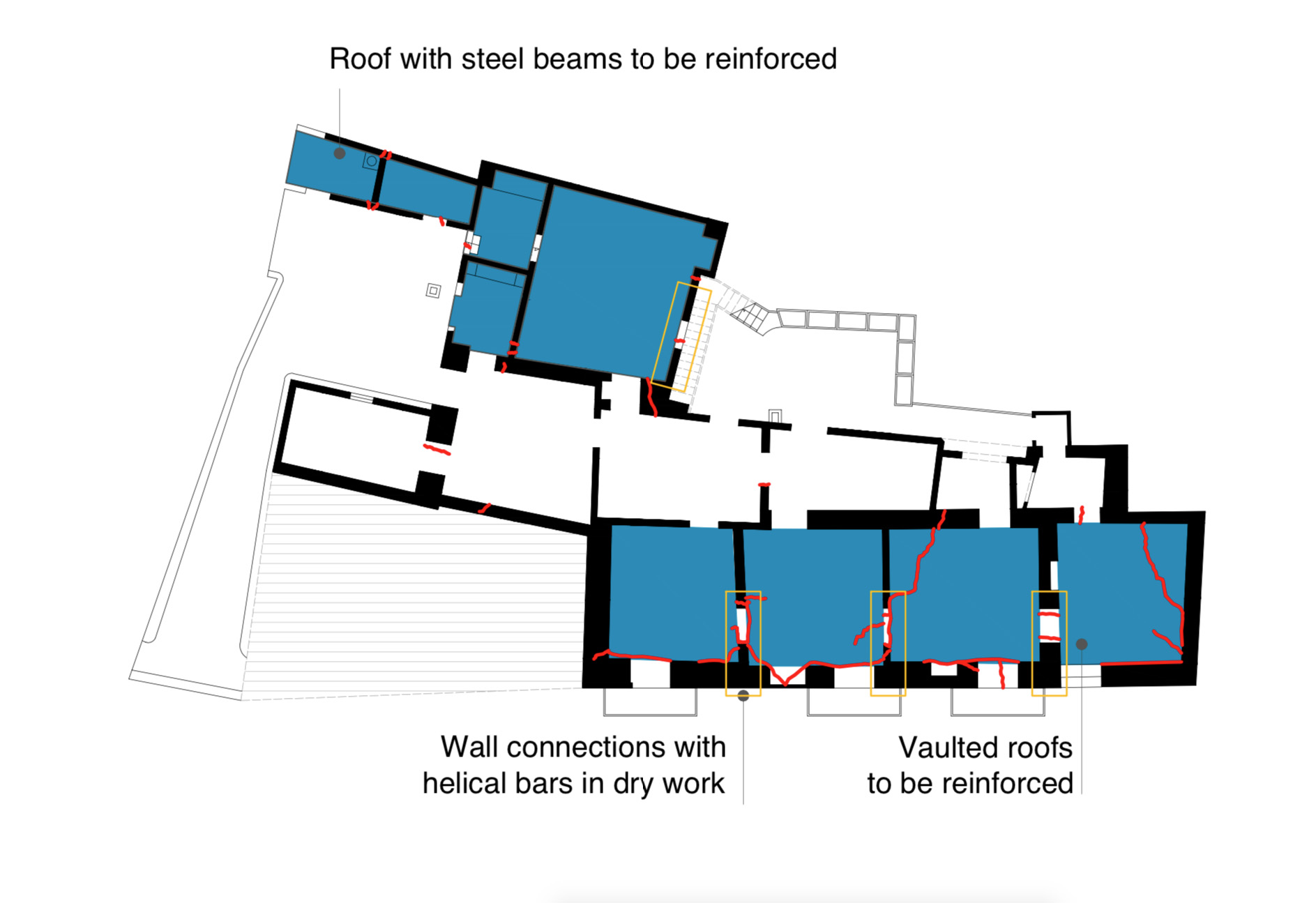 Tutto questo ha suggerito un approccio conservativo legato al minimo intervento, con attenzione ai segni del passato, percorrendo secoli di storia e avviando nel contempo una ricerca sino ad un approccio progettuale contemporaneo.