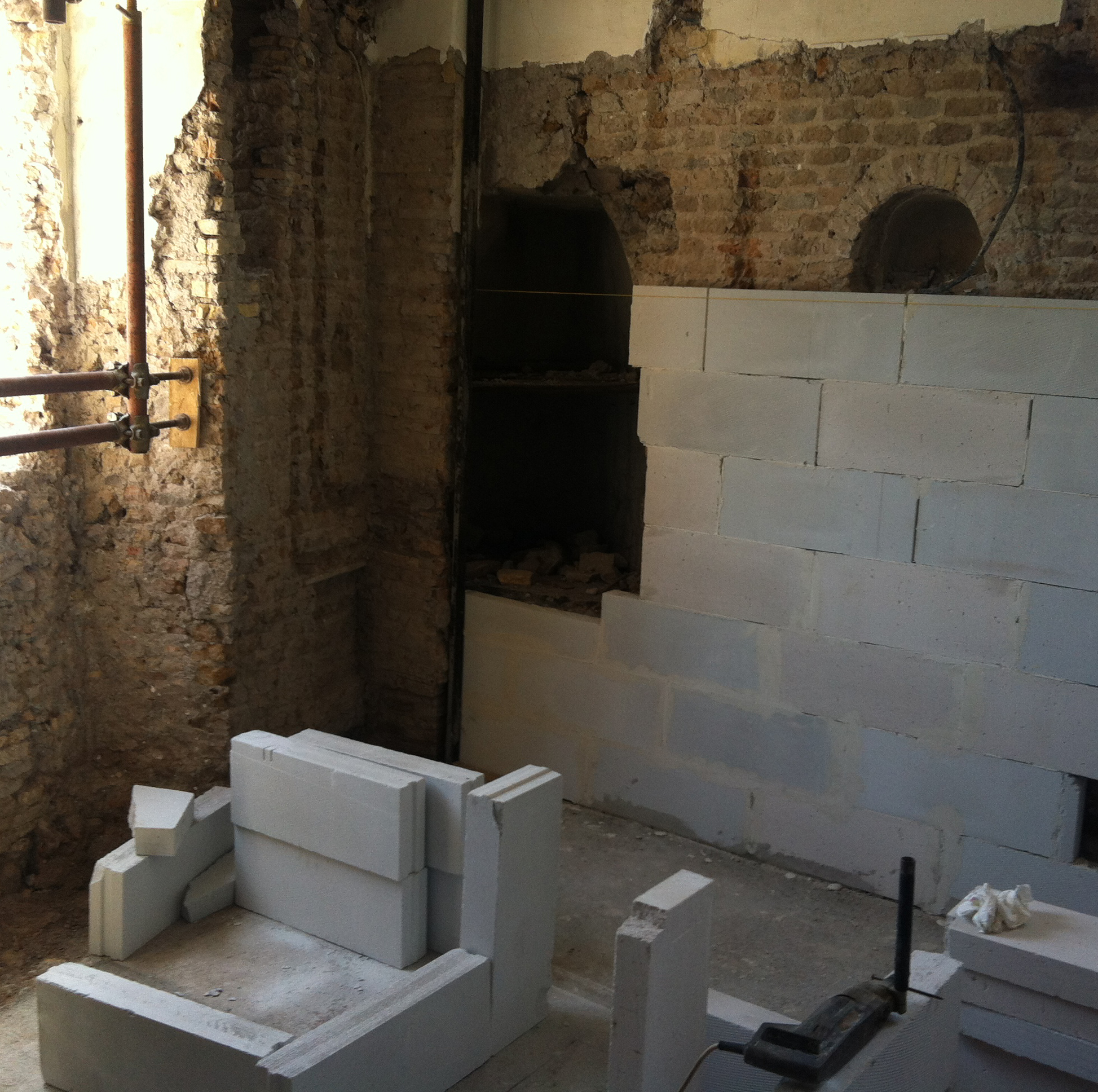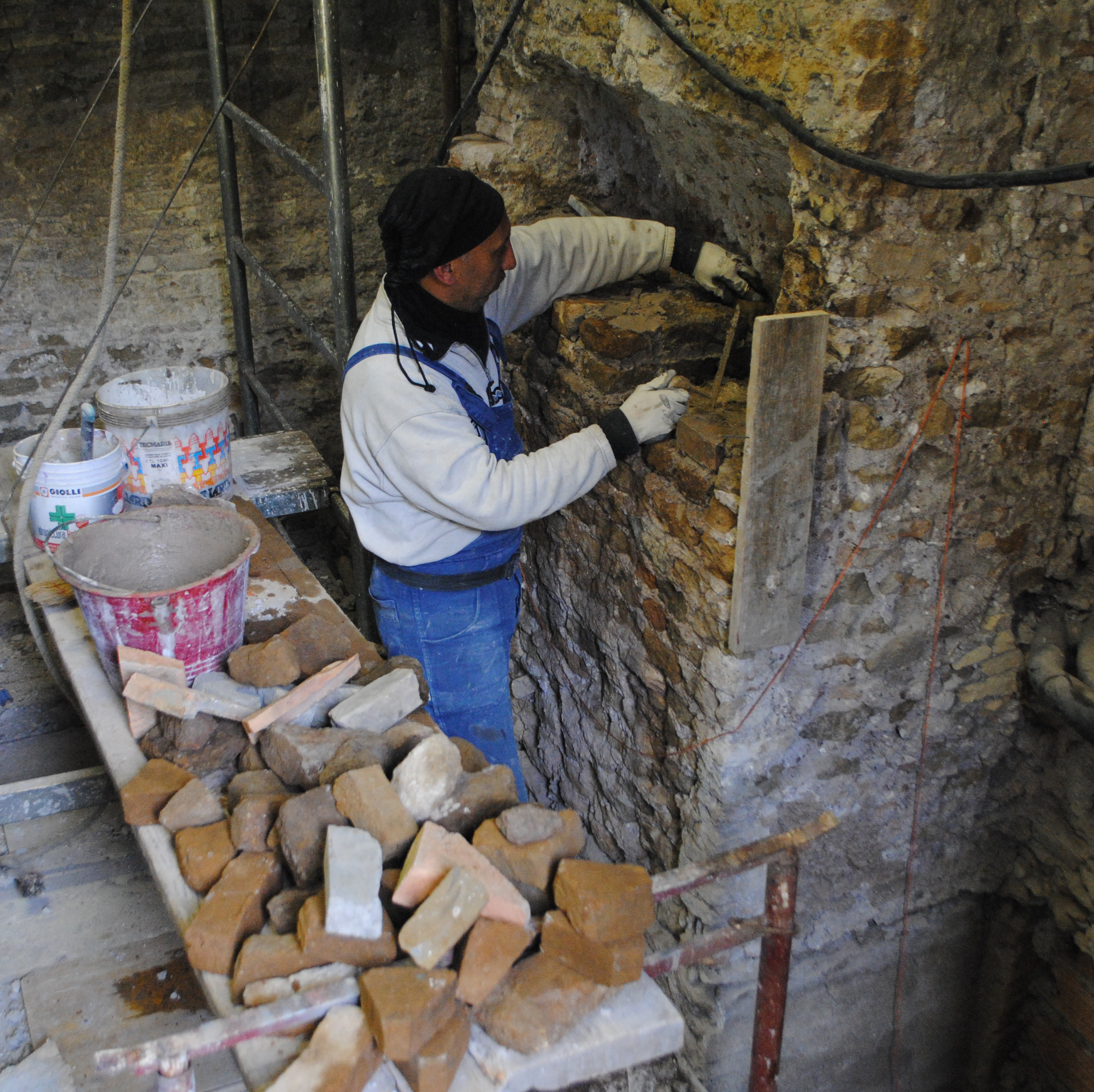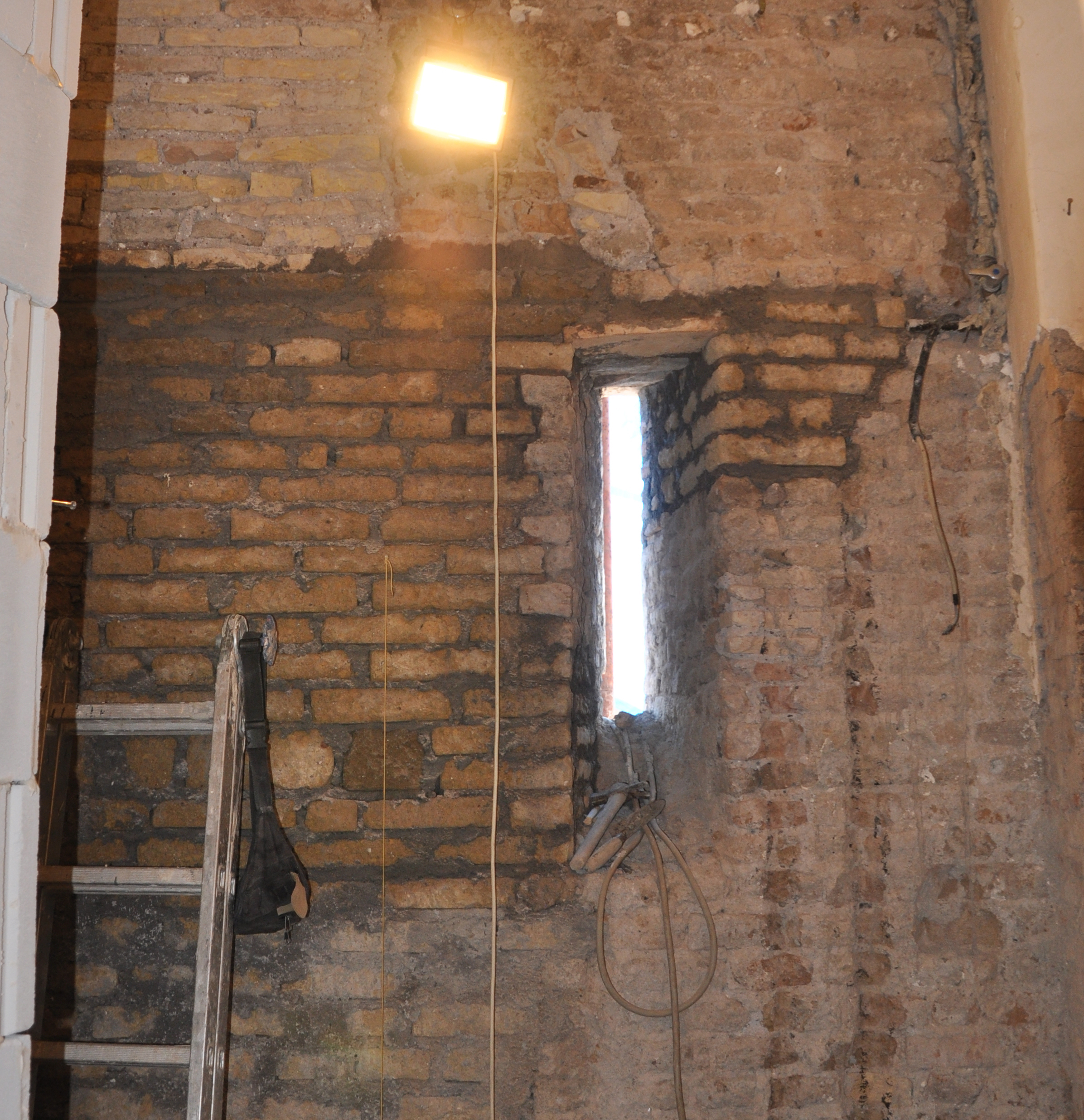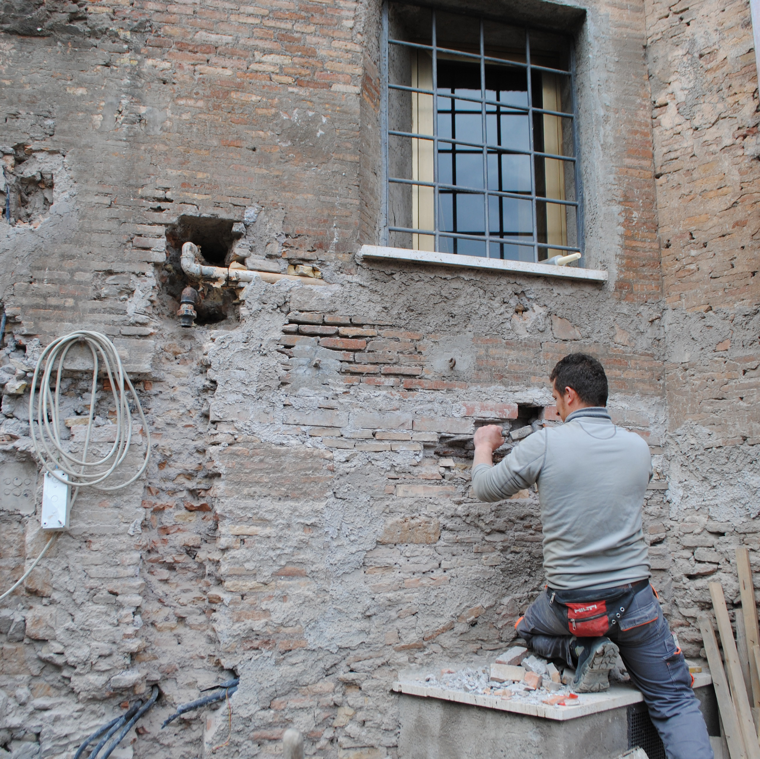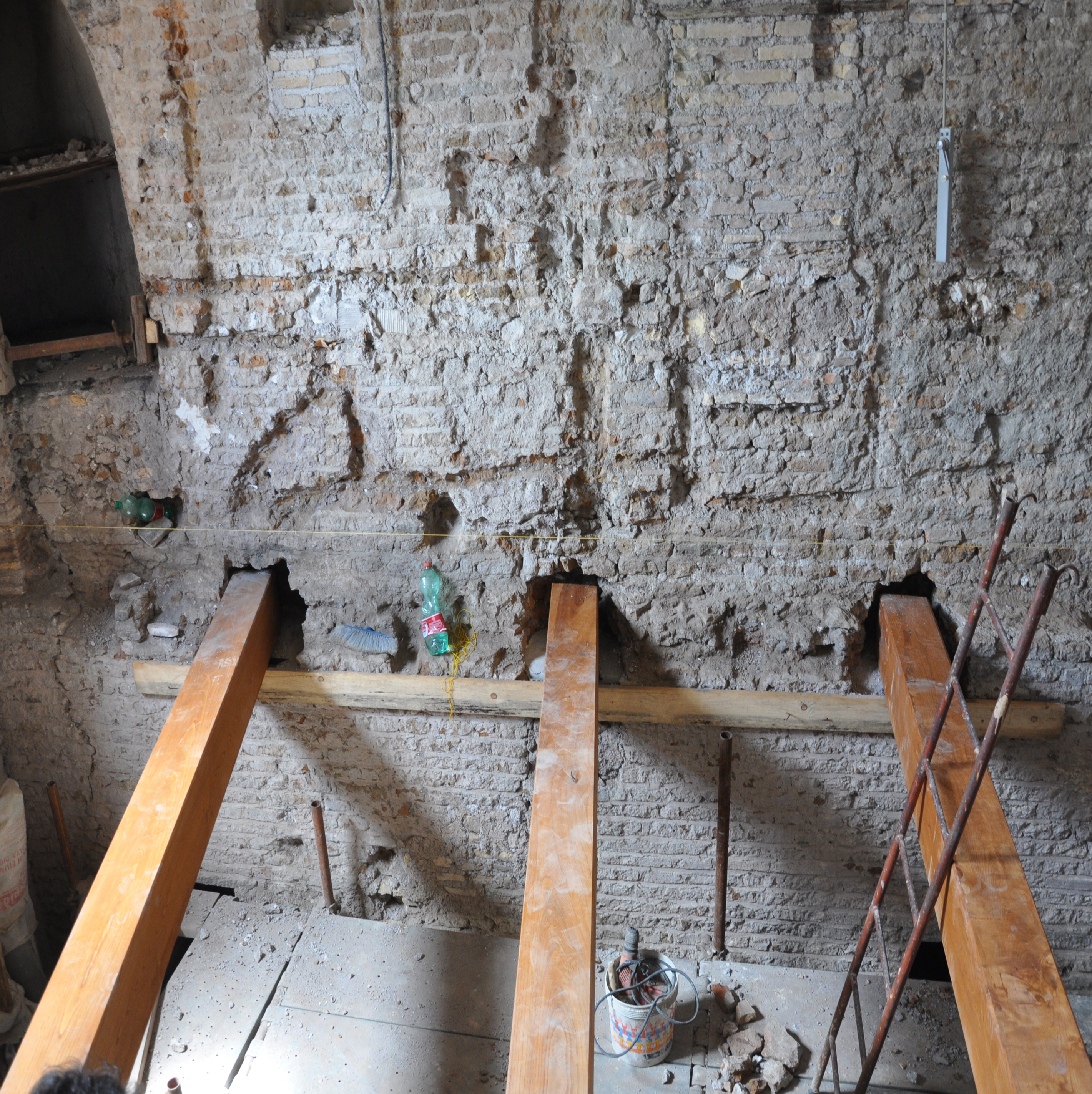 Al fine di restituire alla struttura architettonica dignità formale e mantenere al contempo la sua consistenza documentale, conservando le tracce della sua stratificazione, si è scelto di reintegrare la muratura nei tratti danneggiati in particolare dalla distribuzione caotica della rete impiantistica, sia dove il danno si presentasse come “figura”, sia dove assumesse dimensioni tali da mettere in pericolo la solidità della struttura.