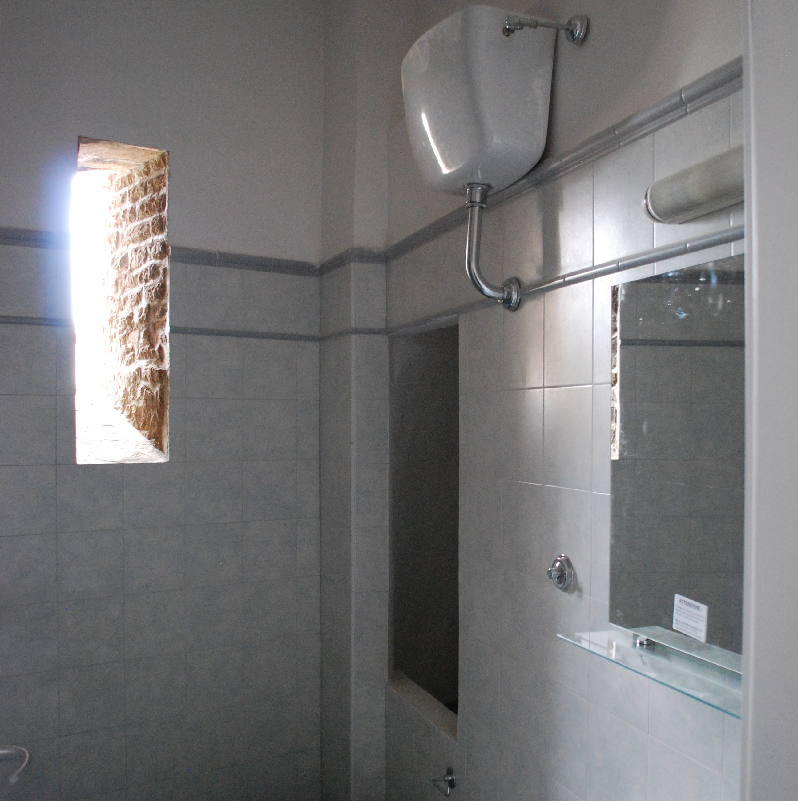 Sono poi stati realizzati la nuova tramezzatura e il montaggio dei sanitari e dei relativi impianti, con l’accorgimento di creare intercapedini sottili a ridosso dei muri perimetrali antichi in corrispondenza dei sanitari per il passaggio delle condutture, in modo da tutelare le murature originarie. Sono stati inoltre adeguati alle norme vigenti l’impianto di riscaldamento e quello elettrico, quest’ultimo con canaline esterne di rame o, sempre esterno, in filo di seta e ceramica.