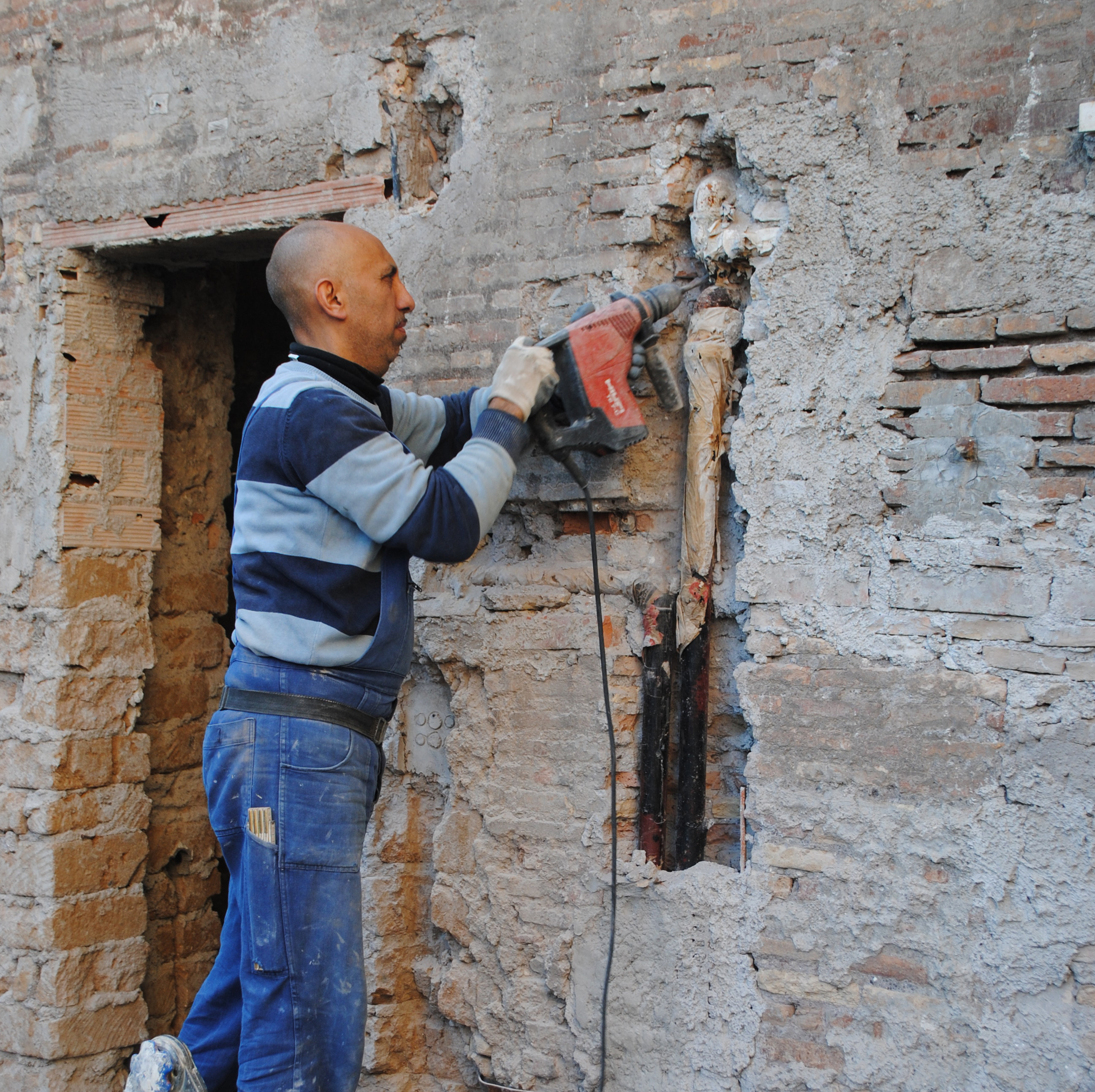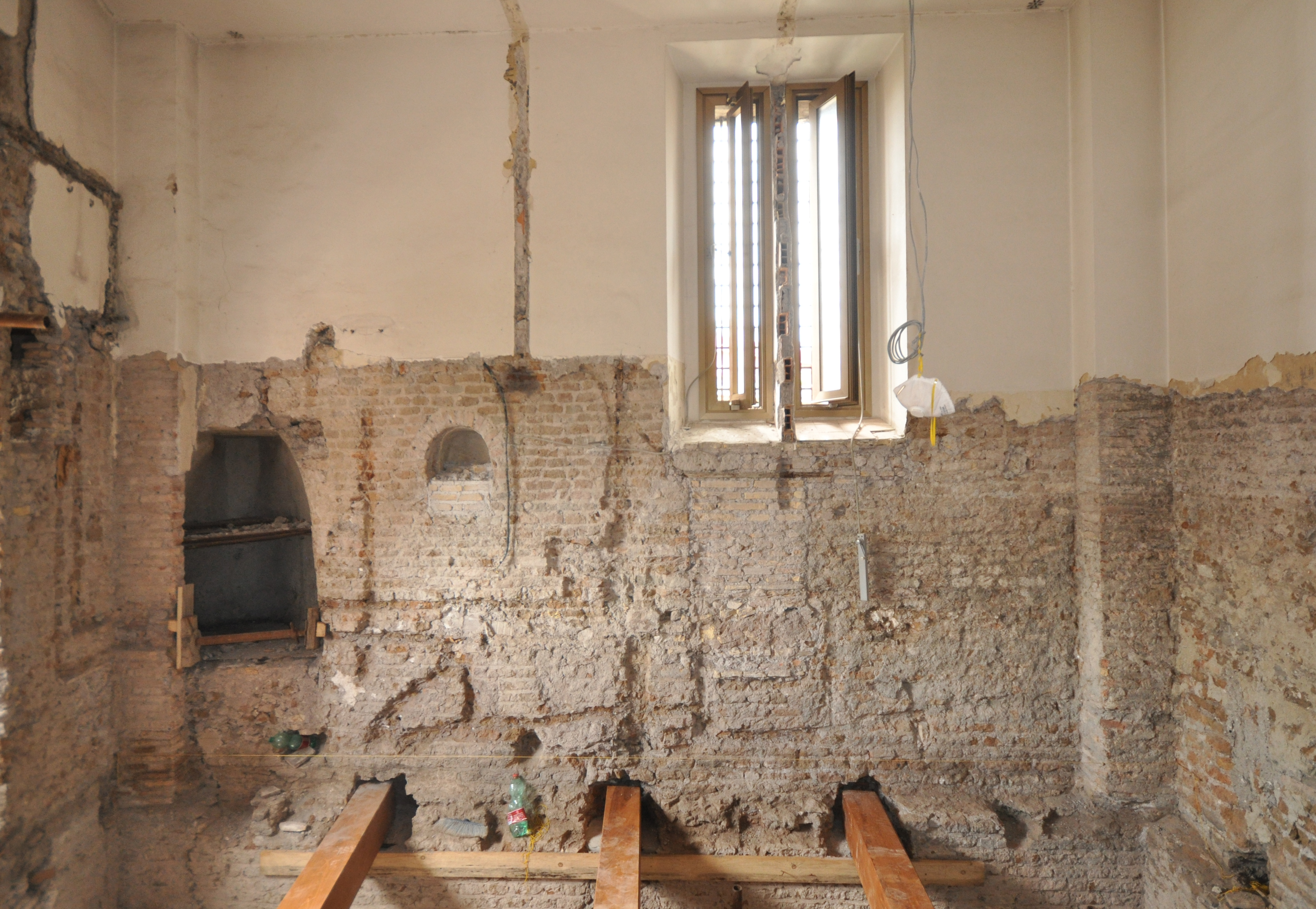 Le prime operazioni sono consistite nella rimozione degli impianti, nello smantellamento totale delle strutture moderne e degli elementi fatiscenti del solaio, nella rimozione degli intonaci moderni fino al solaio del secondo piano e nello scavo archeologico. Questi interventi hanno permesso di raggiungere una conoscenza molto avanzata delle strutture storiche e del loro stato di conservazione, essenziale per la progettazione esecutiva.