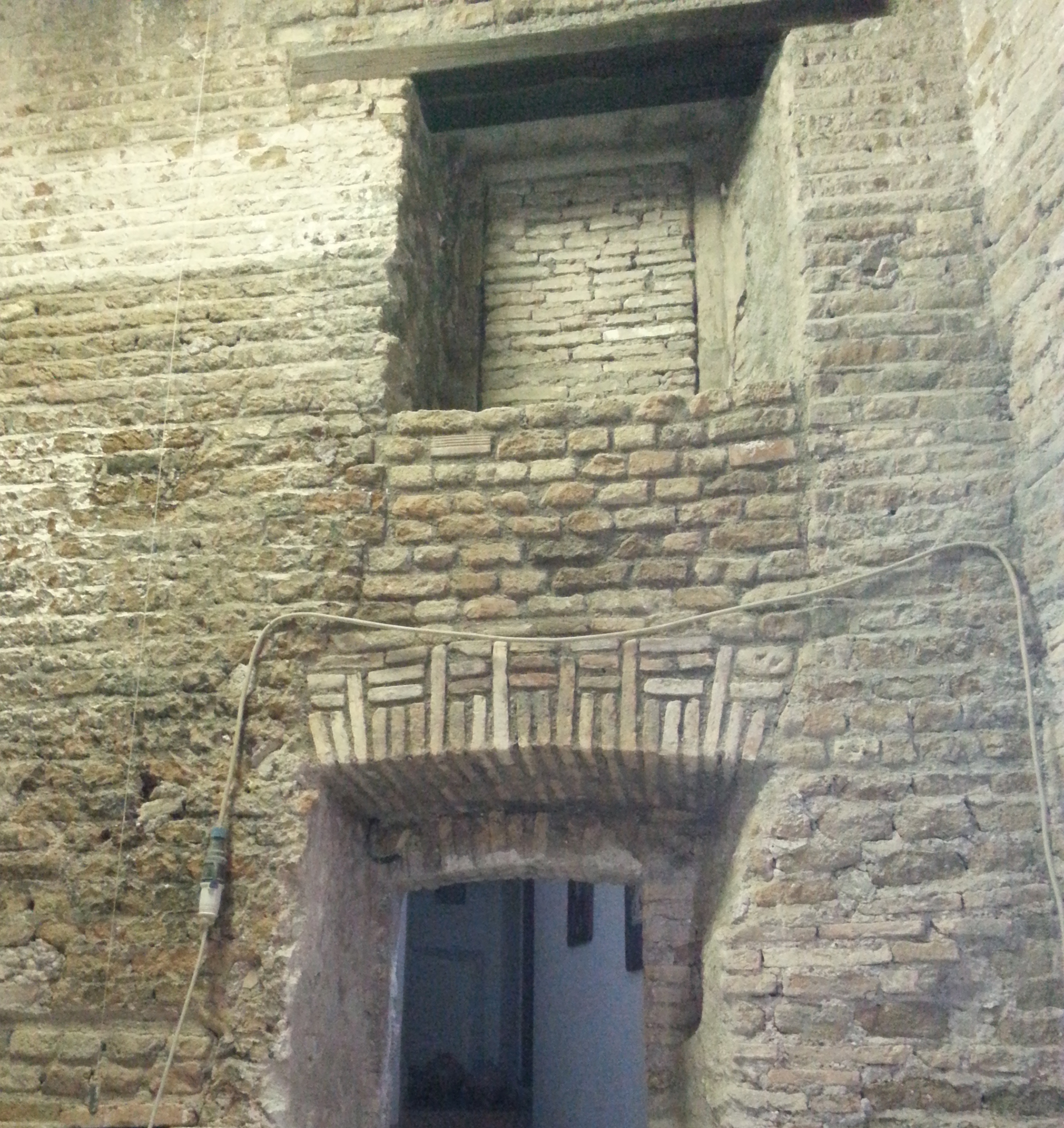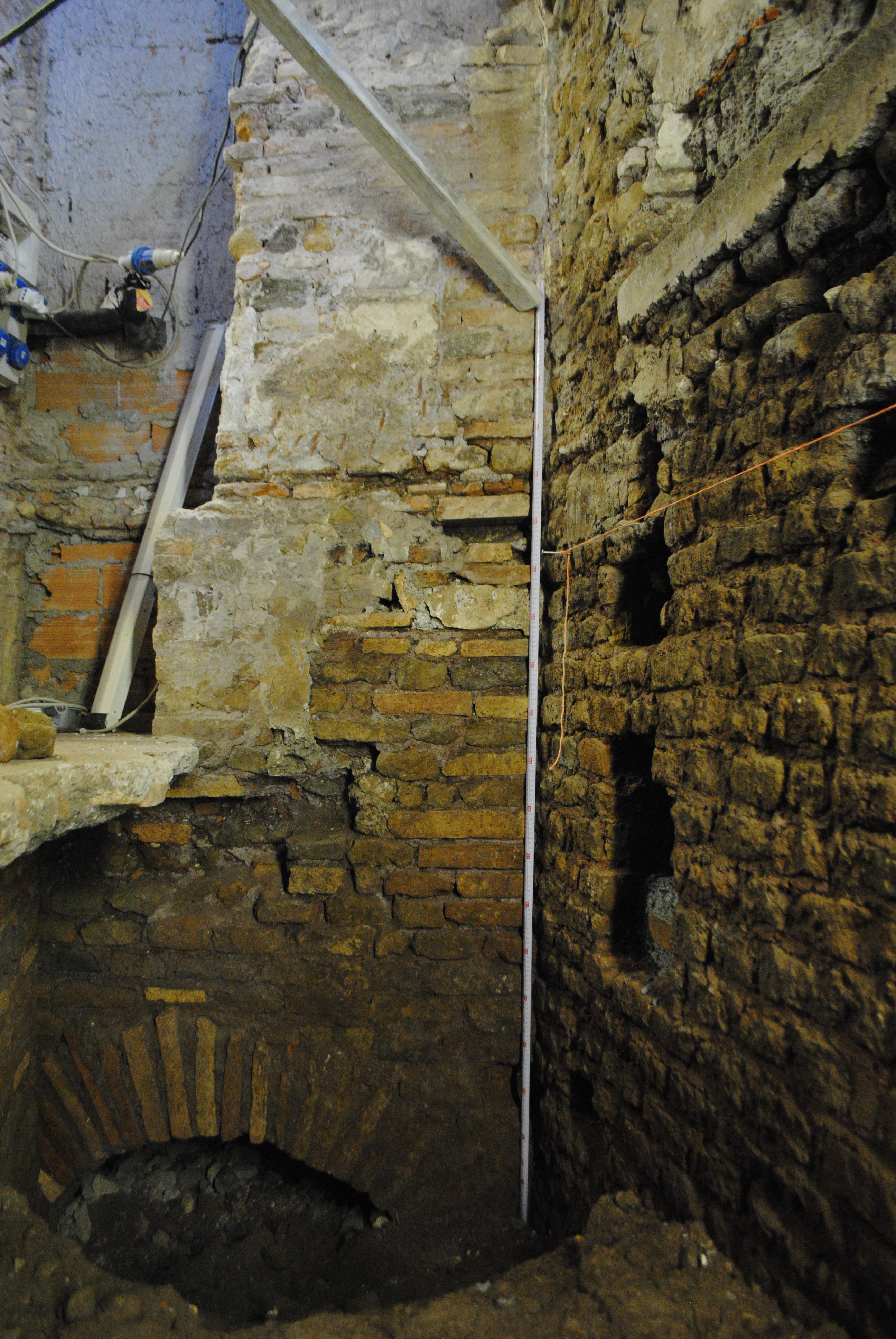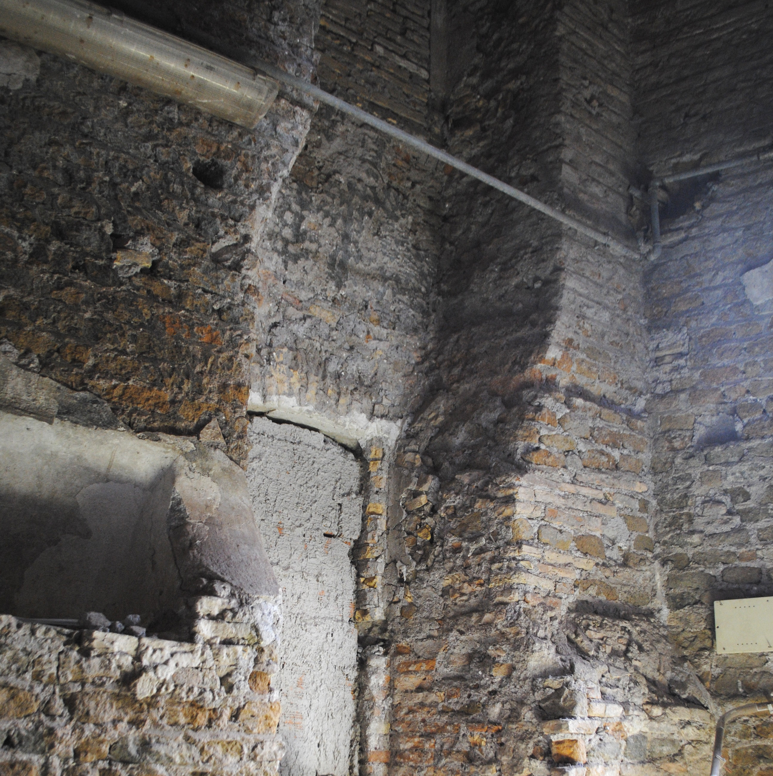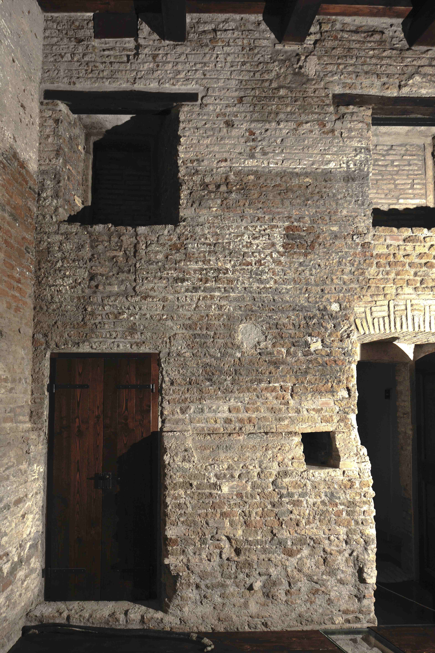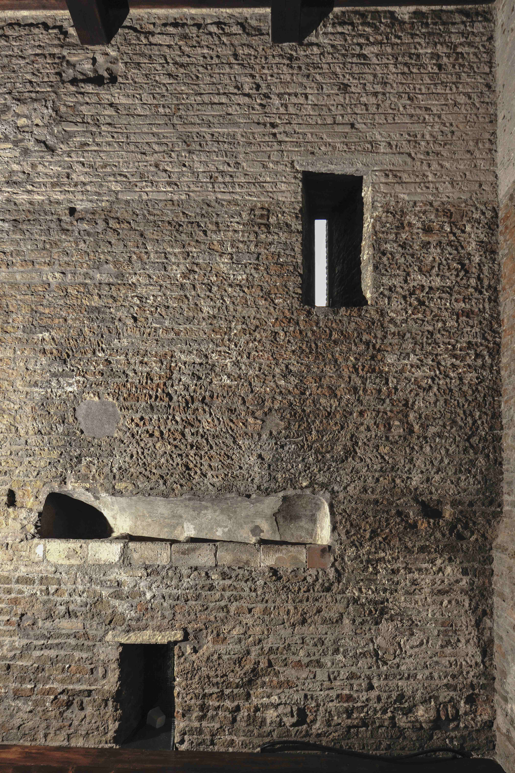 mettevano in comunicazione la torre con l’adiacente monastero, e che confermavano la presenza di due piani al posto dell’attuale piano terra. Gli accessi erano separati dai resti di un livello pavimentato in cocciopesto, appoggiato a nord su di un muro in opera listata, ortogonale alla parete est della torre, che formava una sorta di stretto corridoio. Addossato alla faccia nord di quest’ultimo muro si è rinvenuta una seconda parete in opera laterizia con arco ribassato, probabilmente posta a contrasto di possibili cedimenti dei muri est e ovest del vano.
