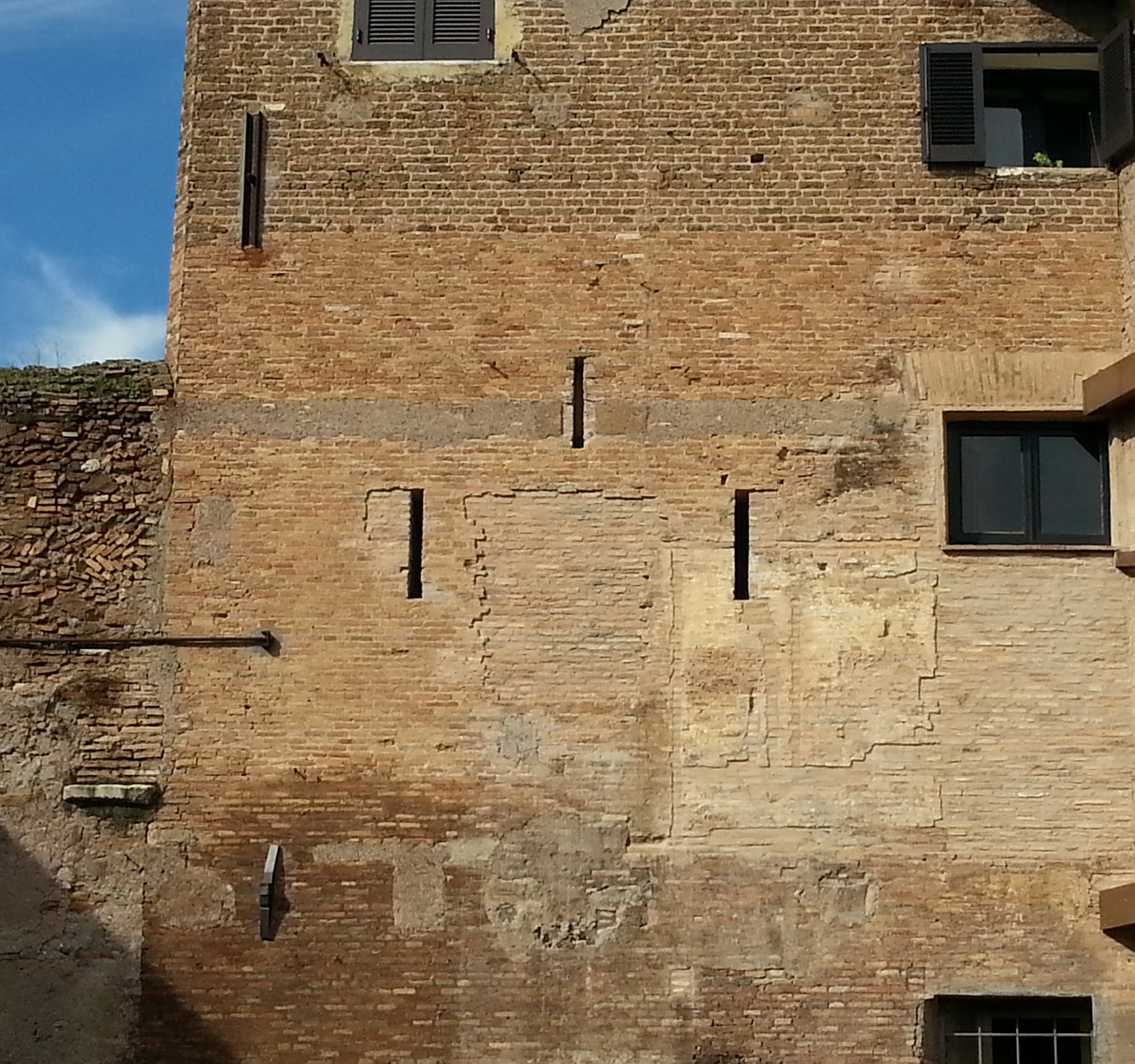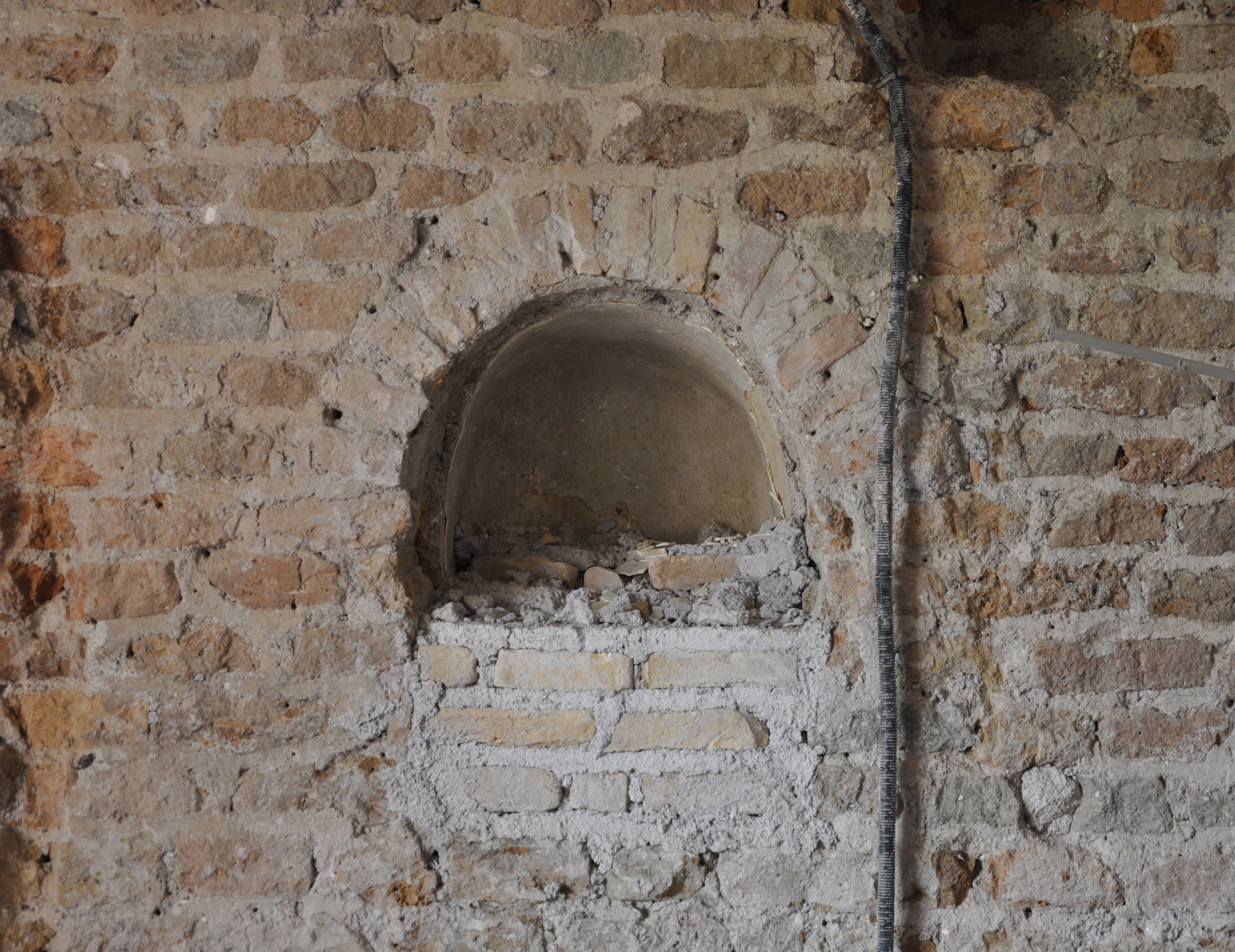 Nello stesso tempo, però, non si è trascurato di assicurare la distinguibilità tra il nuovo e l’antico, rendendo riconoscibili le riprese del paramento murario con un leggero sottosquadro, in modo che i bordi delle integrazioni, accostandosi senza legarsi, lasciassero intuire l’esistenza della lacuna. Si è avuta inoltre l’accortezza d’inserire radi elementi datanti, costituiti da campioni di materiali moderni provenienti dalle demolizioni effettuate nello stesso cantiere.