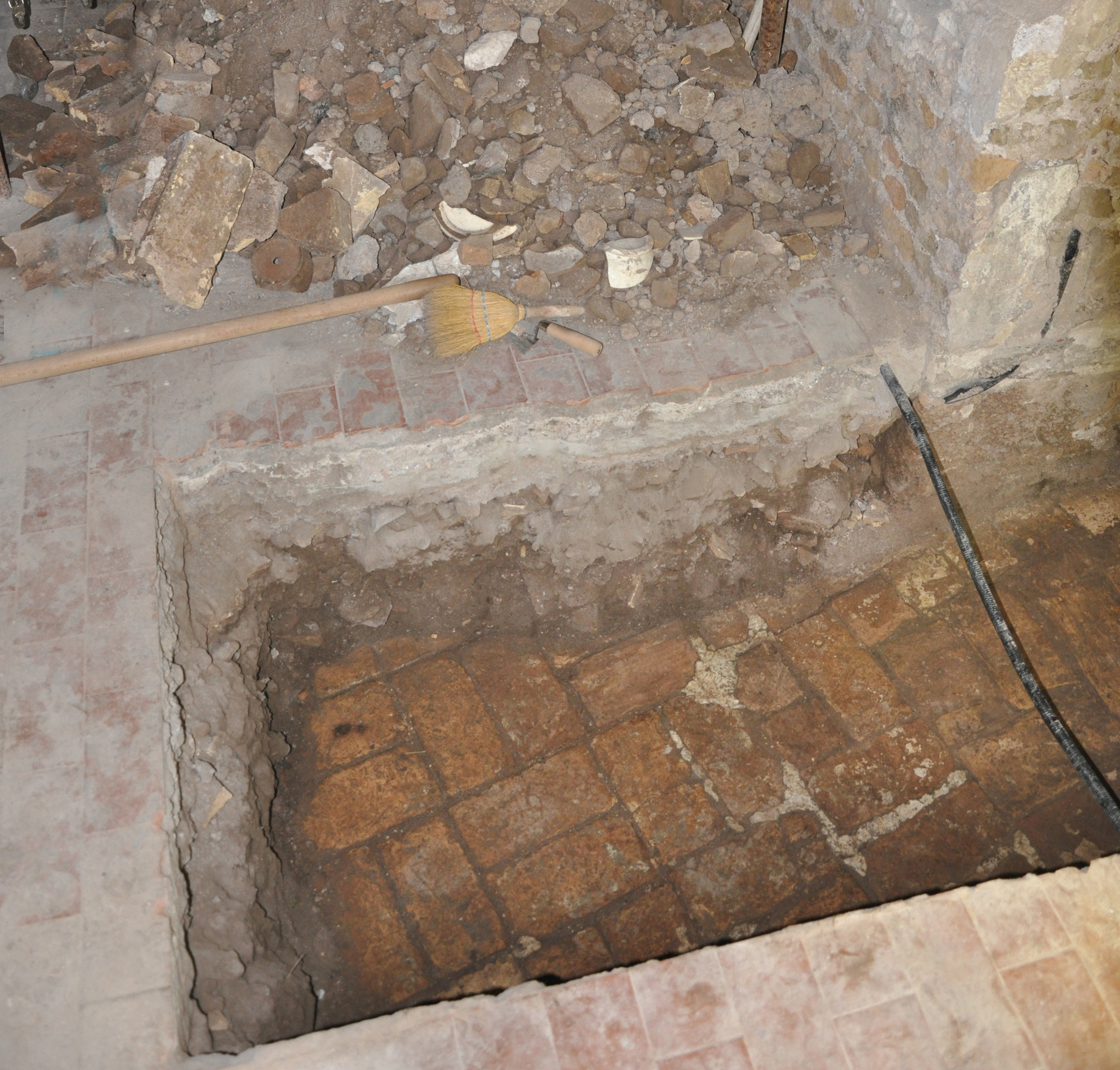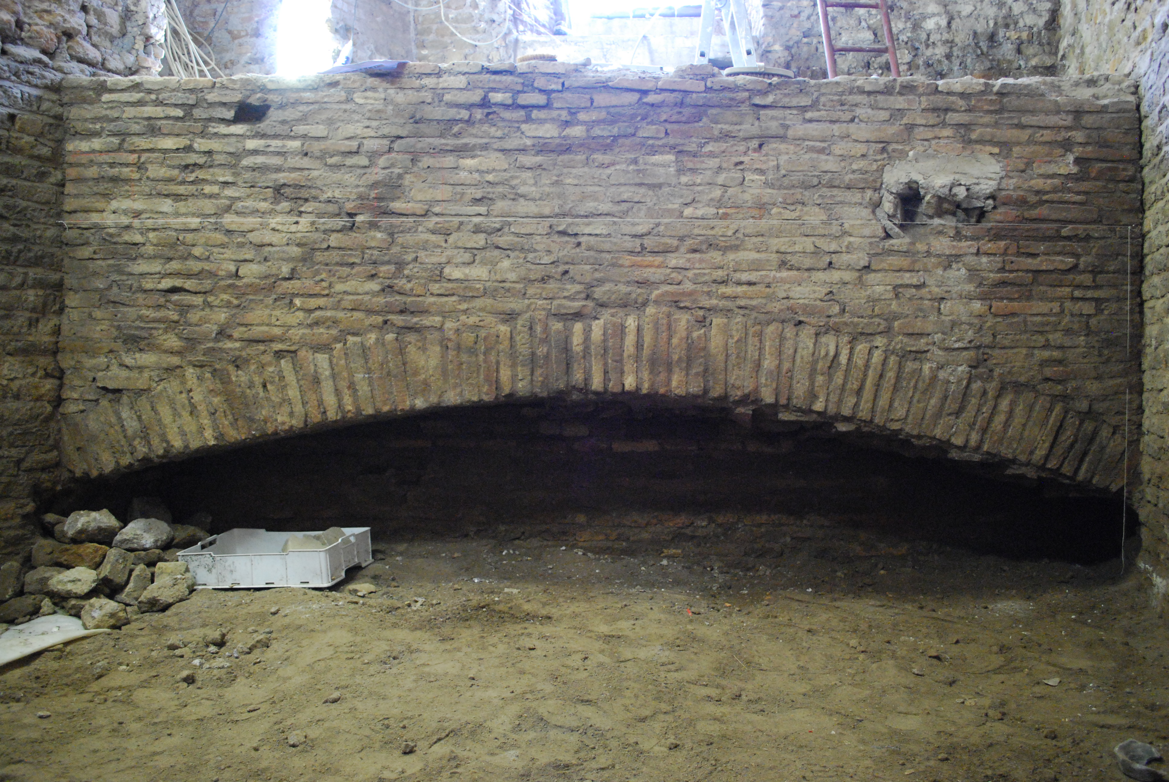 Nello specifico, poiché il piano terra della torre si presentava parzialmente interrato e i livelli pavimentali modificati – il piano esistente si collocava circa un metro sotto la risega che corrispondeva al livello medievale del primo piano fuori terra -, si sono indagate le quote originarie tramite scavo archeologico. Rimosso il pavimento moderno in battuto, corrispondente a un uso degradato del vano, sono stati rintracciati un pavimento in mattoni rettangolari esteso a tutto l’ambiente e più in profondità un piano di calpestio in malta, al di sotto del quale la torre fu riempita da uno spesso strato di materiali provenienti da demolizioni. Contestuali ai diversi livelli erano le tracce di modifiche delle soglie e delle porte del lato est. In particolare si sono scoperti due accessi sovrapposti, che