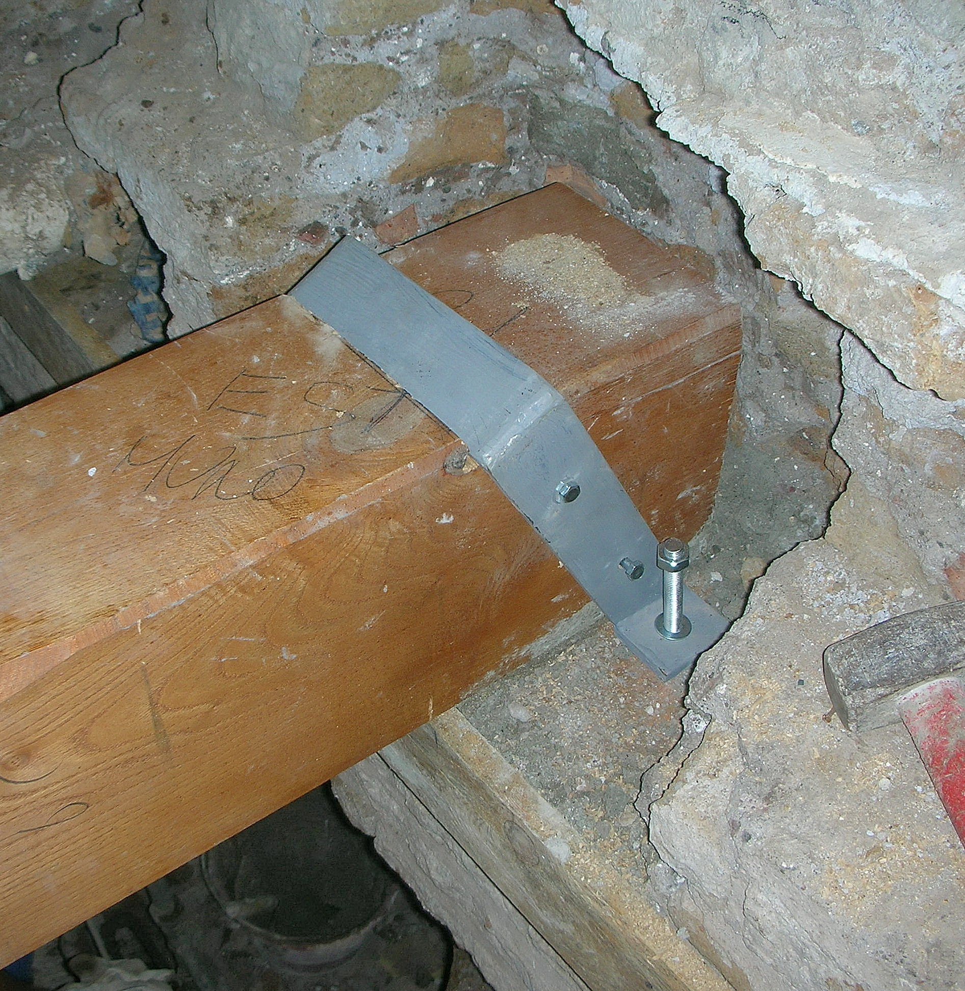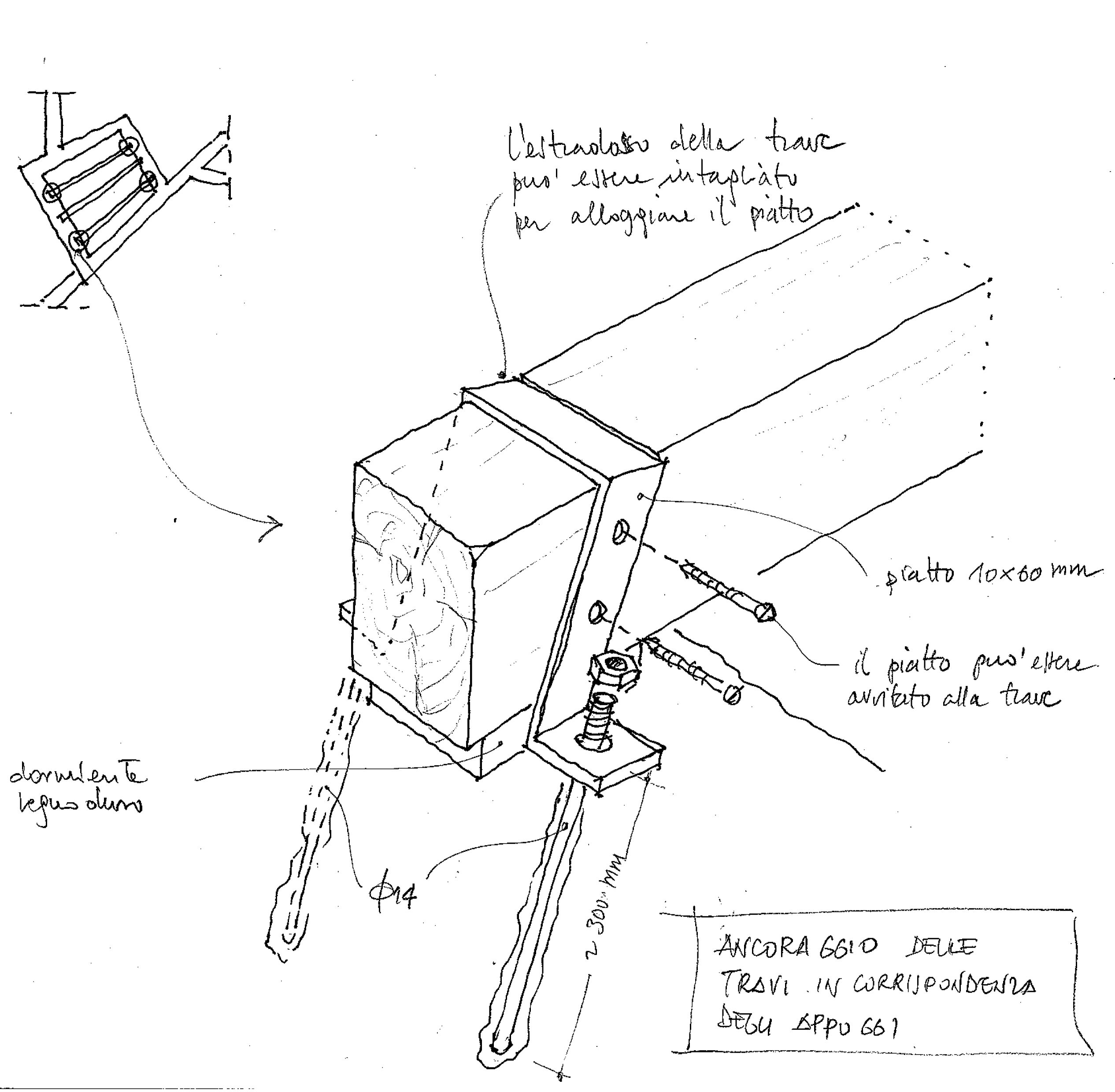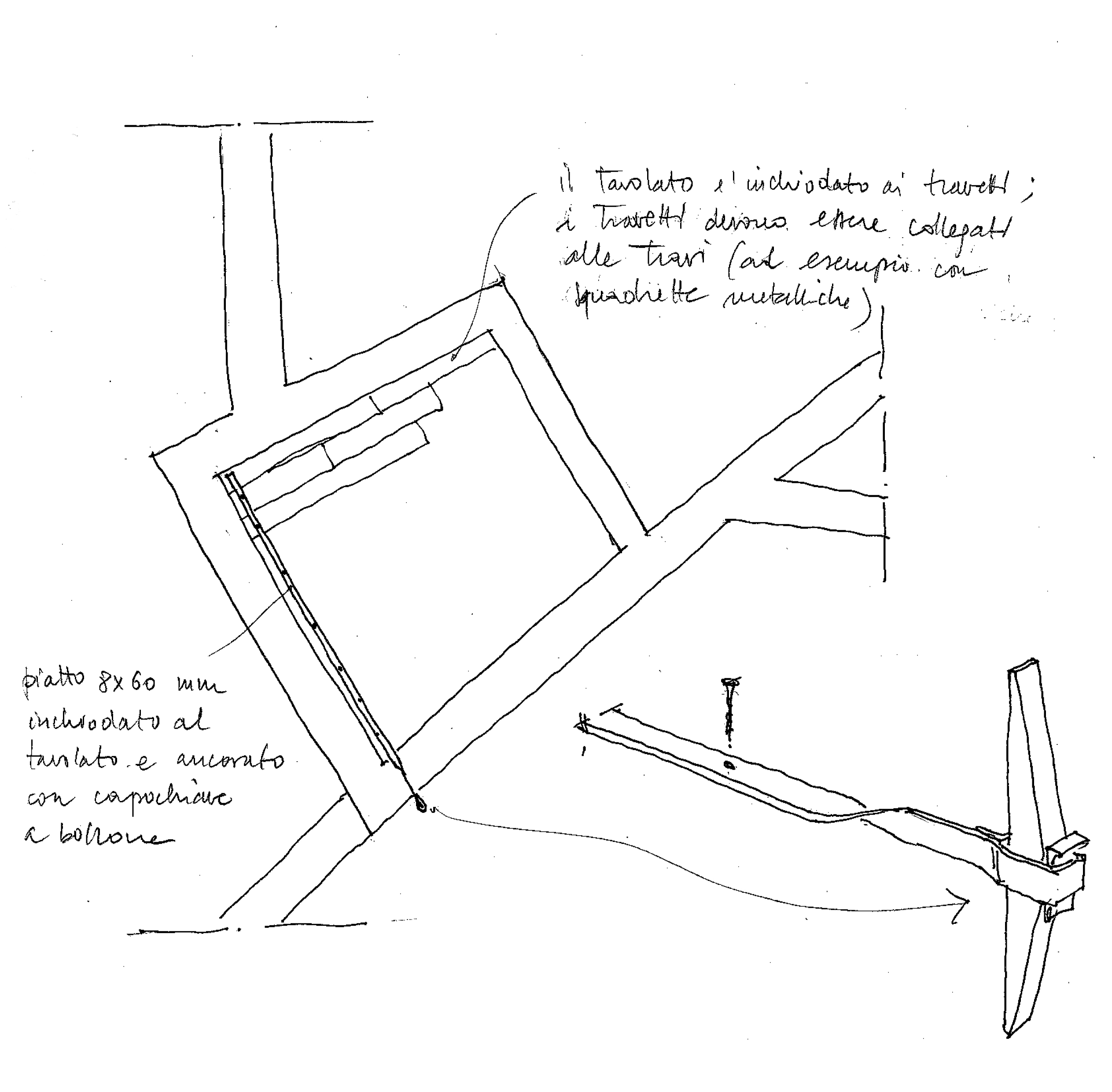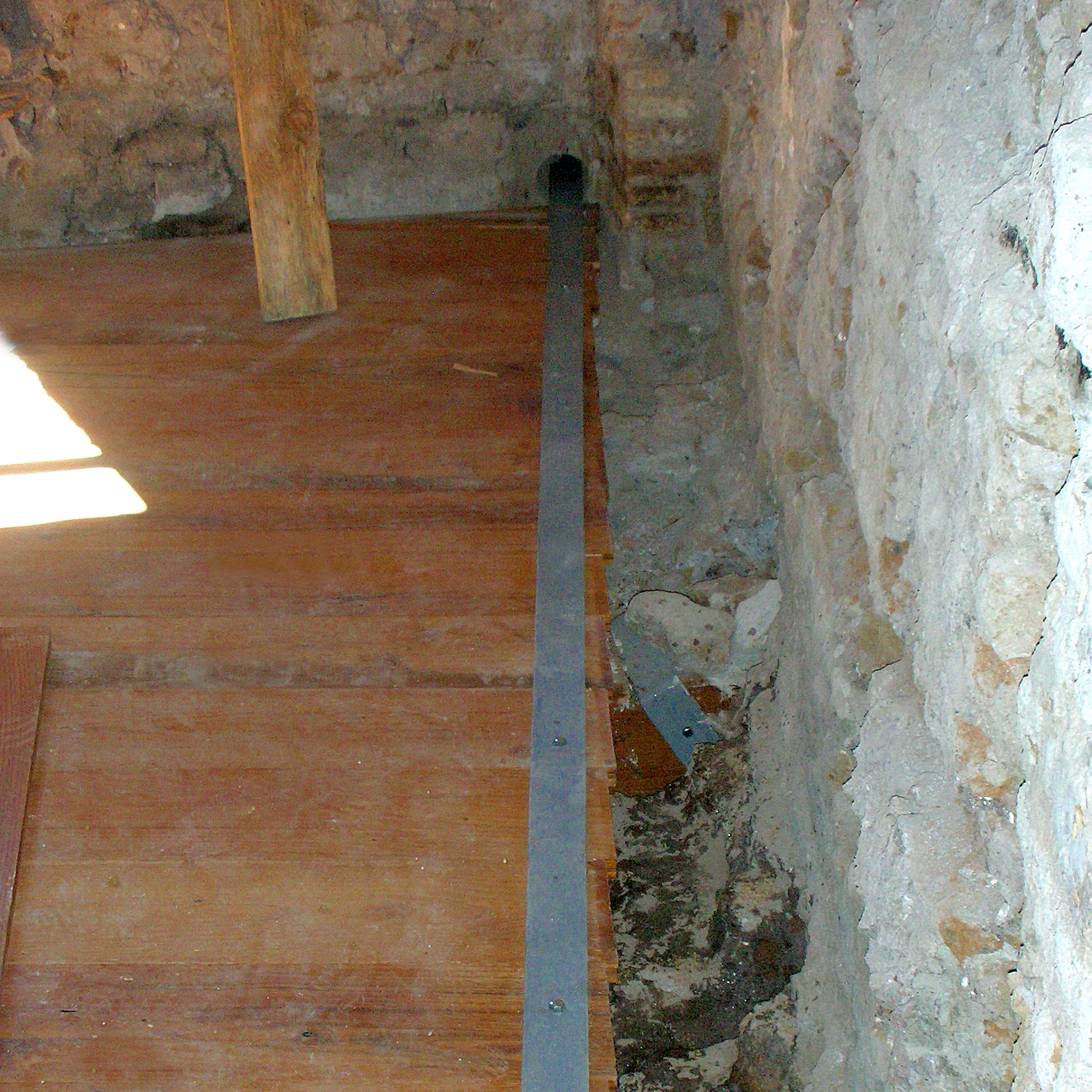 Per rendere solidali le travi lignee con la muratura e garantire la partecipazione del solaio all’effetto scatolare delle pareti è stata inserita nella testata di tutte le travi una staffa metallica. Una catena piatta, inoltre, ancorata da un lato alle travi e al tavolato lignei del solaio e dall’altro alla muratura della parete sud-est, serve a contenere un meccanismo, manifestatosi con leggere lesioni, di ribaltamento della parete verso l’esterno. Il massetto del solaio è stato soprelevato di 10 cm per favorire la predisposizione a pavimento degli scarichi con le sufficienti pendenze a convergere verso un nuovo unico discendente esterno in rame e ghisa, situato all’esterno sullo spigolo tra la torre e il corpo di fabbrica annesso, collegato a un pozzetto esistente connesso alla rete di smaltimento. Le feritoie originarie del lato sud-est, prospicienti il giardino, sono state riaperte e utilizzate per aerare e illuminare i nuovi bagni, mentre è stata tamponata, sullo stesso lato, la finestra aperta a scasso in epoca recente nella muratura antica.