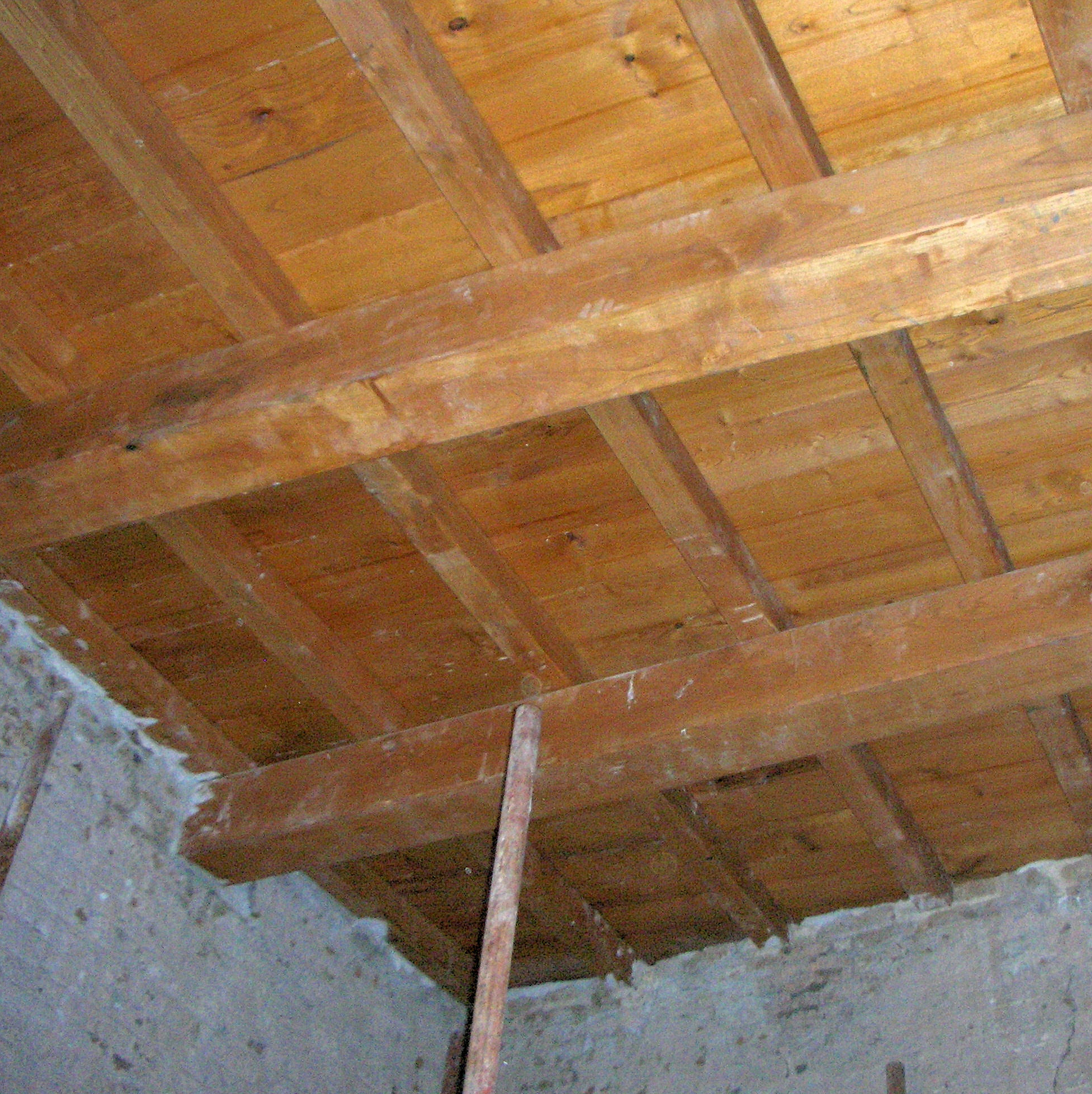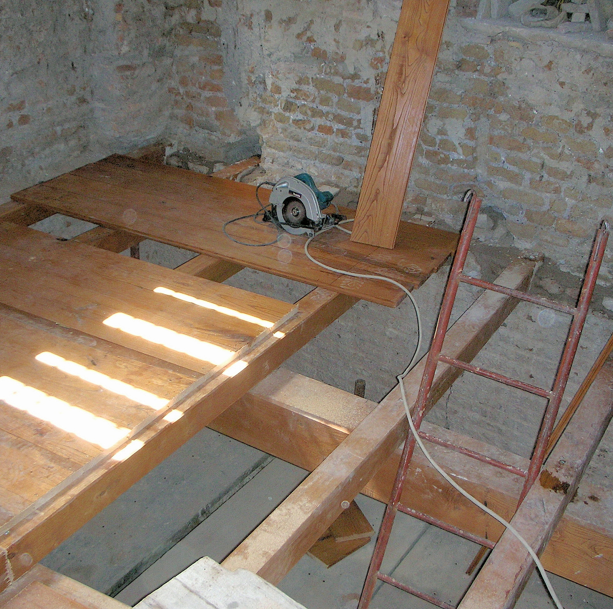 Al primo piano, demolite le vecchie tramezzature e smontati i sanitari esistenti e i relativi sistemi impiantistici, è stato eseguito il restauro dell’orditura primaria del solaio ligneo e la sostituzione dell’orditura secondaria danneggiata, con una struttura realizzata ad identicum in legno di castagno a filo sega pretrattato, con tavolato maschiettato.