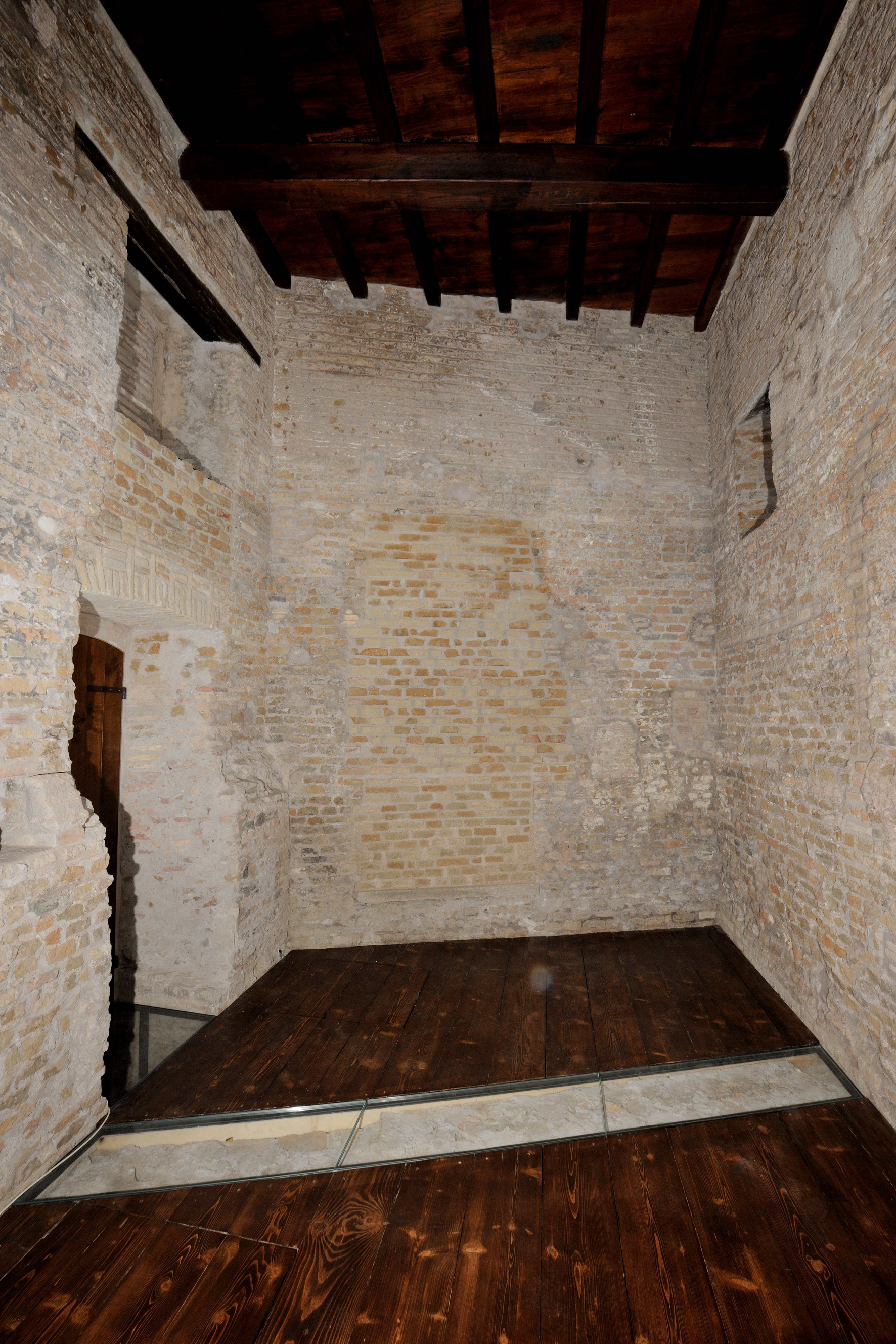 Al primo piano, invece, è stato necessario mantenere i servizi igienici in attesa di un loro futuro quanto auspicabile trasferimento in altro luogo. Grazie, però, al completo smantellamento dei bagni esistenti, e delle caotiche strutture metalliche di rinforzo del solaio ligneo sul quale insistevano, si sono liberate le superfici storiche da ogni elemento incongruo e sono state individuate e riaperte le finestre originarie. Al secondo piano, utilizzato come cappella e privo di particolari rischi dal punto di vista conservativo, non si è intervenuti.