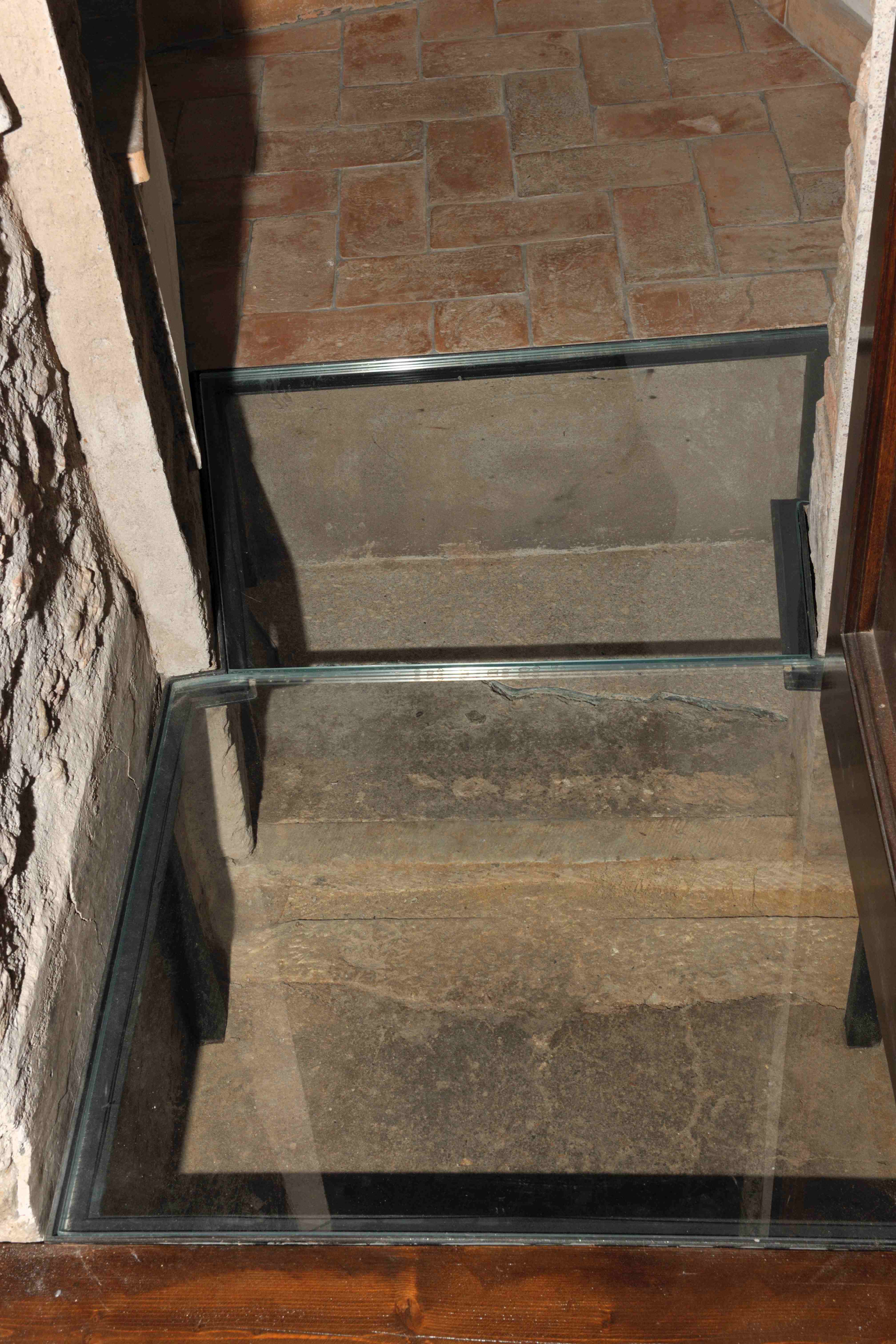 Lungo il lato esterno sud-est della torre, poiché il giardino presenta una quota superiore al piano di calpestio della cappella, è stato infine effettuato uno scavo archeologico per permettere l’esecuzione di un vespaio aerato a difesa dall’umidità della parte seminterrata. L’efficacia di tale espediente è stata garantita dal collegamento al sistema di pavimentazioni aerate già realizzato a protezione dall’umidità delle murature degli ambienti adiacenti, favorendo la circolazione dell’aria.