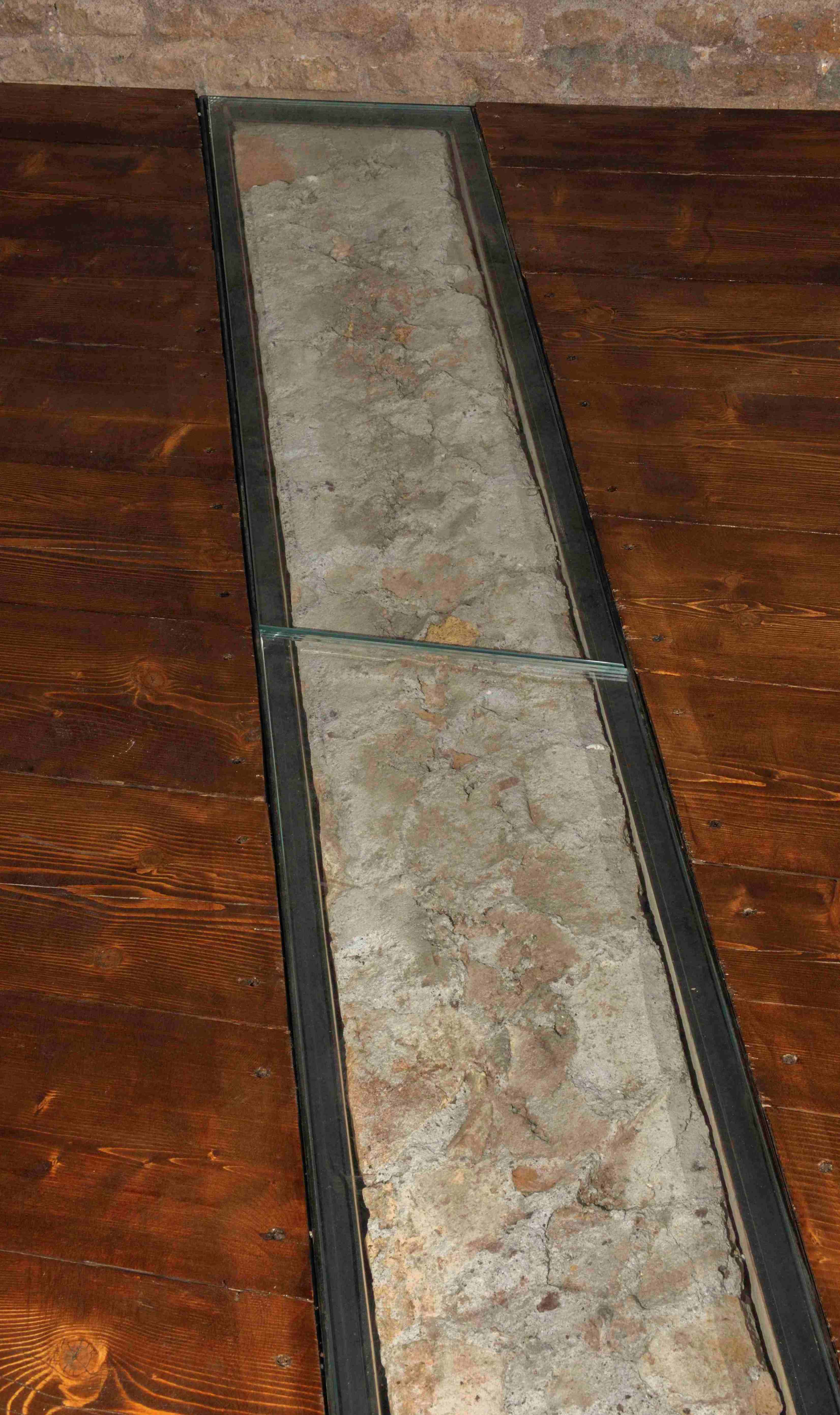 Il pavimento della cappella è stato realizzato mediante un tavolato di castagno, ottenuto con il riuso di tavole da ponte, opportunamente rilavorate e trattate, dove si inseriscono lastre di cristallo stratificato antisfondamento che lasciano a vista parte delle strutture archeologiche.