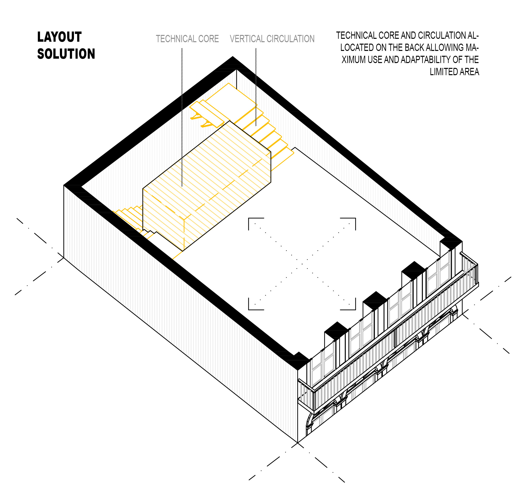 The architectural concept strove for flexible spaces and maximum use of the available area, for which purpose the stairways were placed behind a solid service/technical core, concentrating building installations and freeing up the front area entirely.