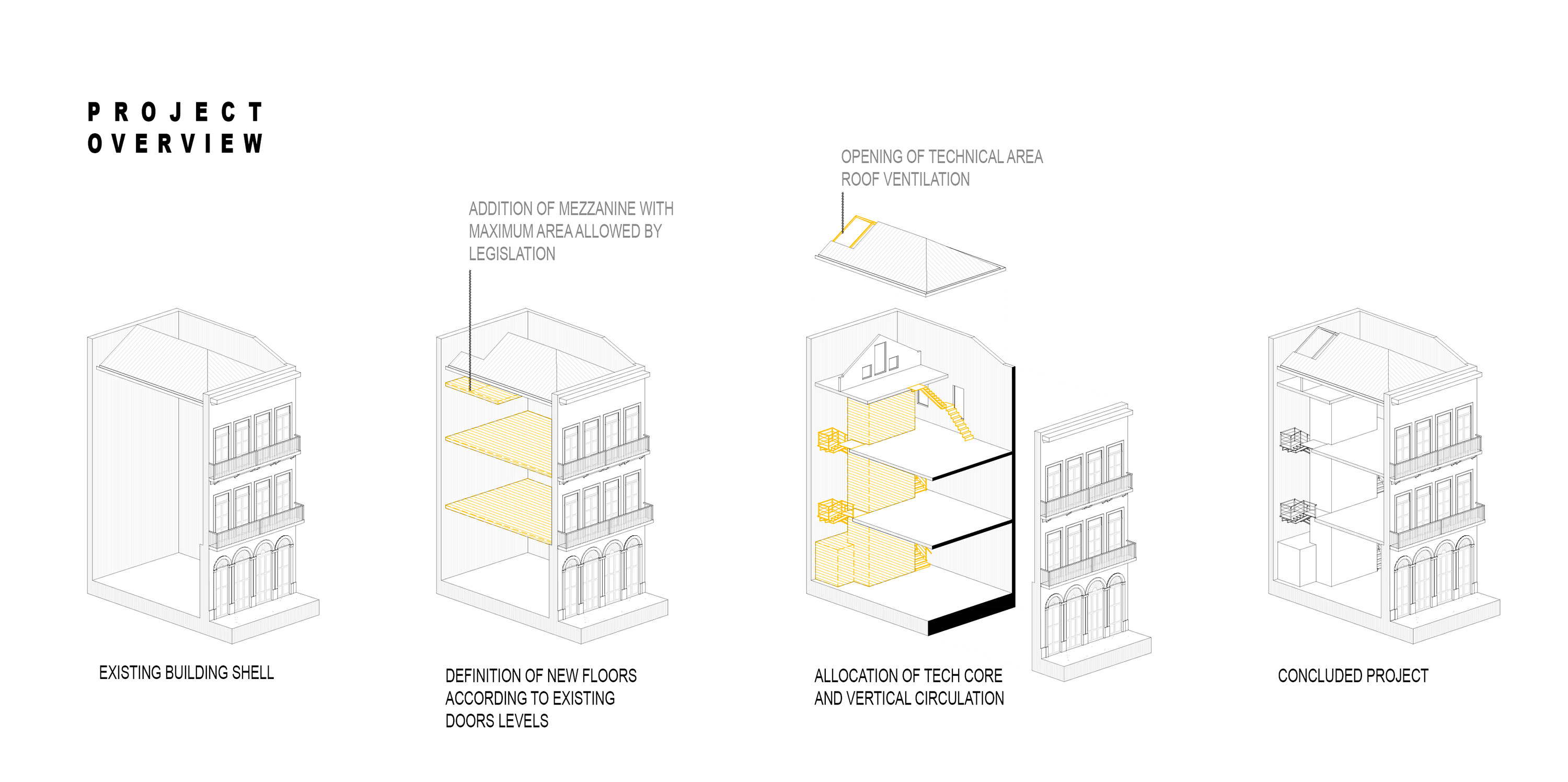 In this case an Integrated Project strategy was adopted, which intended for the joint development of the architectural and structural designs. The definition of the structural concept took in consideration the poor quality of the soil and the excellent stability of the external masonry walls, leading to a structural solution that placed all new loads on those walls, without any new foundations.