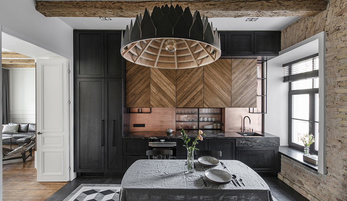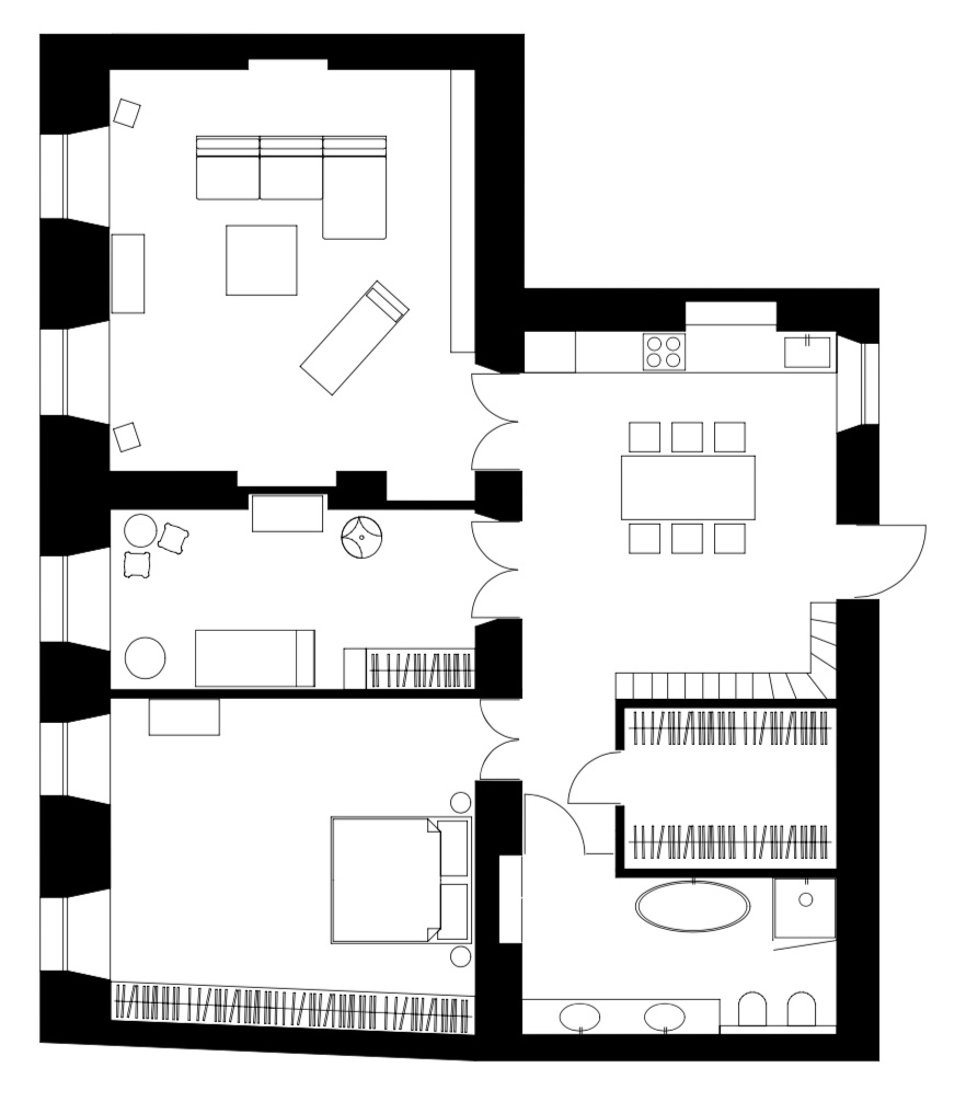 This is the interior of the apartment in the Old Town of Vilnius. The facades of the Old Town’s homes and the cozy walled inner courtyards, with their texture, colors, and aura, found resonance in these homes.