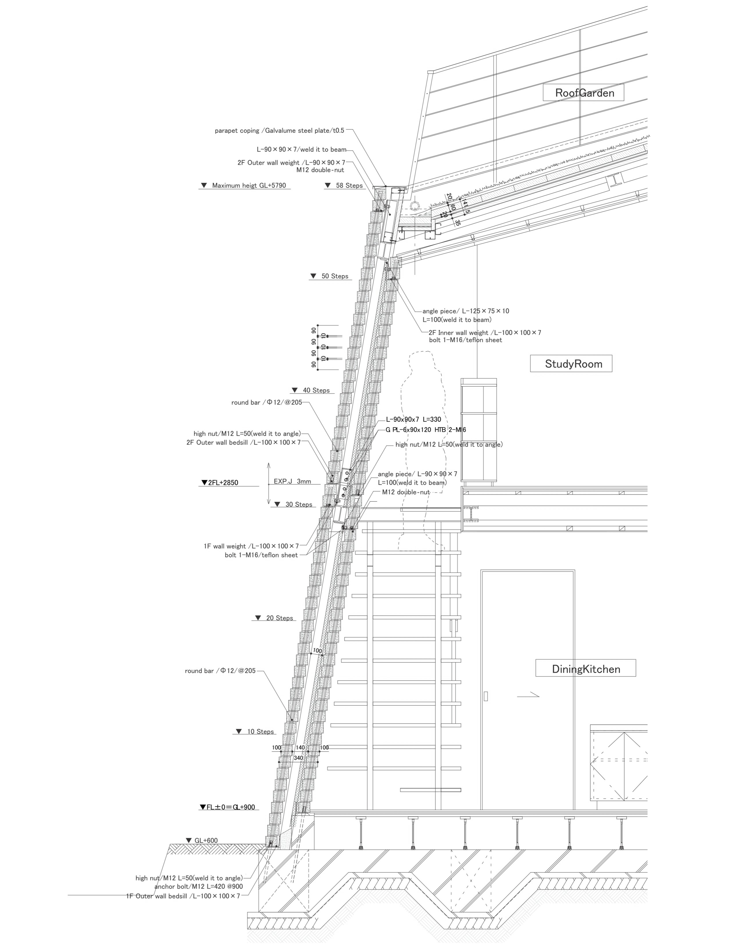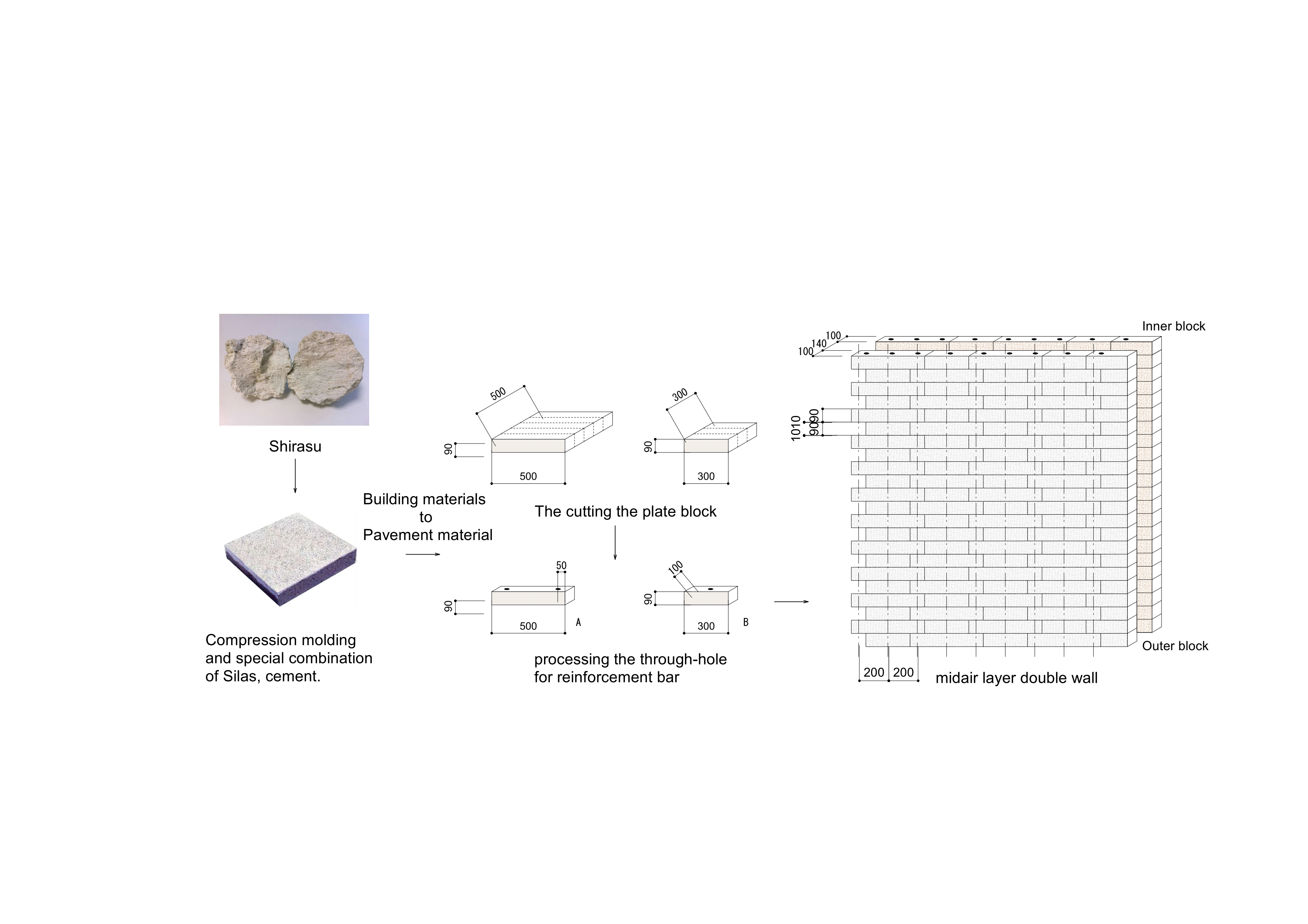 Shirasu has the following unique characters: fire-resistant, high thermal insulation, high humidification, high heat reservation, and light weight.I decided to make use of the existing local technology of producing flat Shirasu blocks by adding high pressure, which had been originally developed for paving roads. I was the first in history that decided to use Shirasu blocks for buildings. The blocks for the outer walls were strengthened by adjusting the amount of Shirasu soil, and the blocks for the inner walls were encrusted with Shirasu ores. The property of Shirasu is expressed in the layers that represent passage of time. Since I adopted an inside-and-outside double layer wall with space of air in between, the entire building looks like a Shirasu cave.