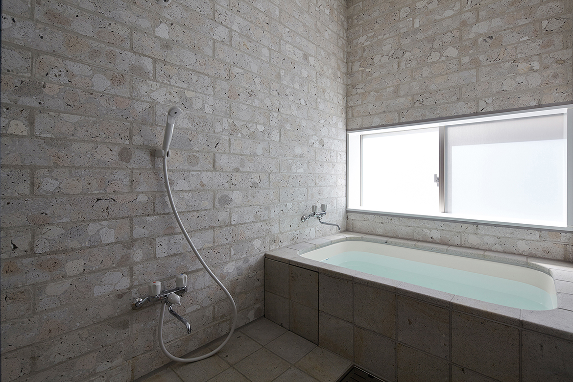 The “Shirasu block” is a sustainable material. The outer wall consists of Shirasu blocks made by mixing Shirasu and cement particles. The inner wall consists of a different type of Shirasu blocks that has been encrusted with Shirasu ores. “Shirasu” refers to soil that had piled up over the years, originating from ash and pyroclastic flow caused by the volcanic eruption of Sakurajima which occurred 25,000 years ago.