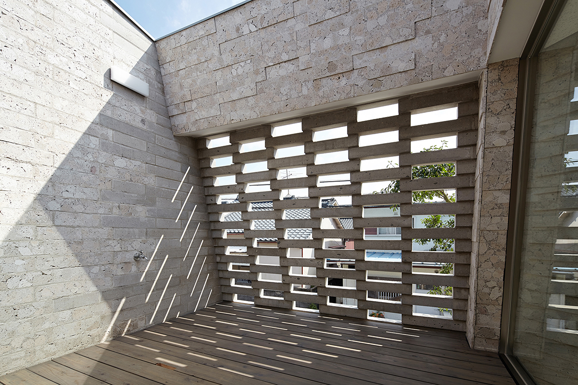 Since the light-weighted Shirasu blocks that are embedded for roof greening functions like soil on the ground, they help reduce the load of the roof. They not only provide positive effect to the urban environment, but also improve energy efficiency. I am glad to hear that the residents who decided not to equip the house with air conditioning devices are now enjoying their new life closely attached to the local natural environment, leaving thermal control to the Shirasu block walls.