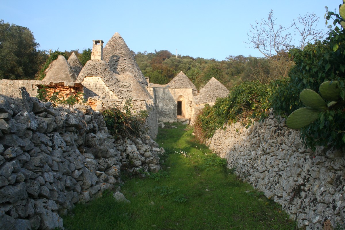 Lo stato di conservazione del complesso di trulli era di degrado avanzatissimo, con crolli evidenti, presenza di vegetazione infestante le cui radici avevano compromesso la statica e la geometria delle forme. Per recuperare le superfici murarie esistenti è stato necessario implementare un intervento scuci-cuci.