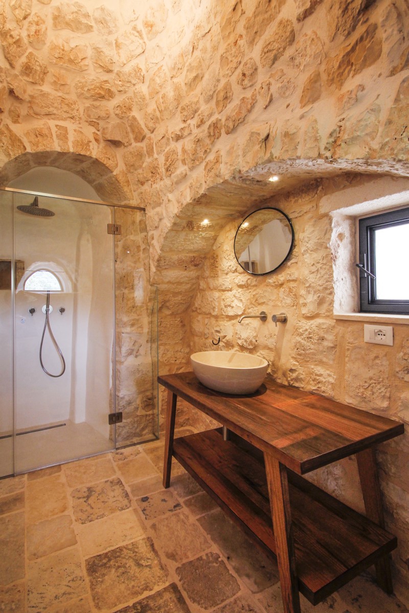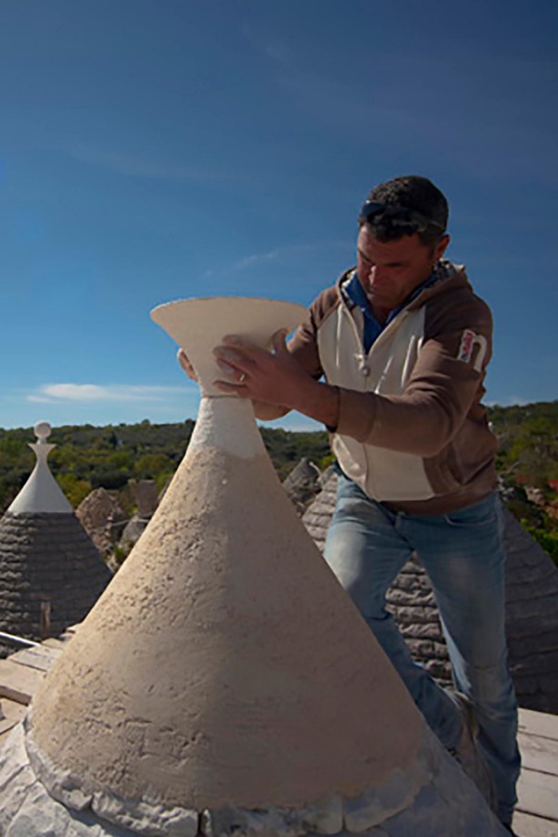 Le porzioni di muratura con pietra leccese lasciate a vista sono state trattate con il prodotto idrorepellente silossanico IS 510 per conferire maggiore idrorepellenza.  Le analisi strumentali condotte in sito con igrometro hanno rilevato la presenza di tassi di umidità elevati in alcuni trulli, in particolare in corrispondenza delle porzioni di muratura controterra. Vista la possibile presenza di infiltrazioni dall’esterno è stata utilizzata la malta osmotica MO 660 sulle superfici interne. A seguire è stato eseguito il ciclo deumidificante con l’applicazione di INTONACO MACROPOROSO 717 preceduto da RINZAFFO 720. In corrispondenza dell’intradosso del cono di copertura dei trulli è stato applicato INTONACO 700, dopodiché, su tutte le superfici risultanti, è stata applicata la FINITURA 750 in due mani e annegata la rete alcali-resistente FASSANET 160 tra la prima e seconda mano.