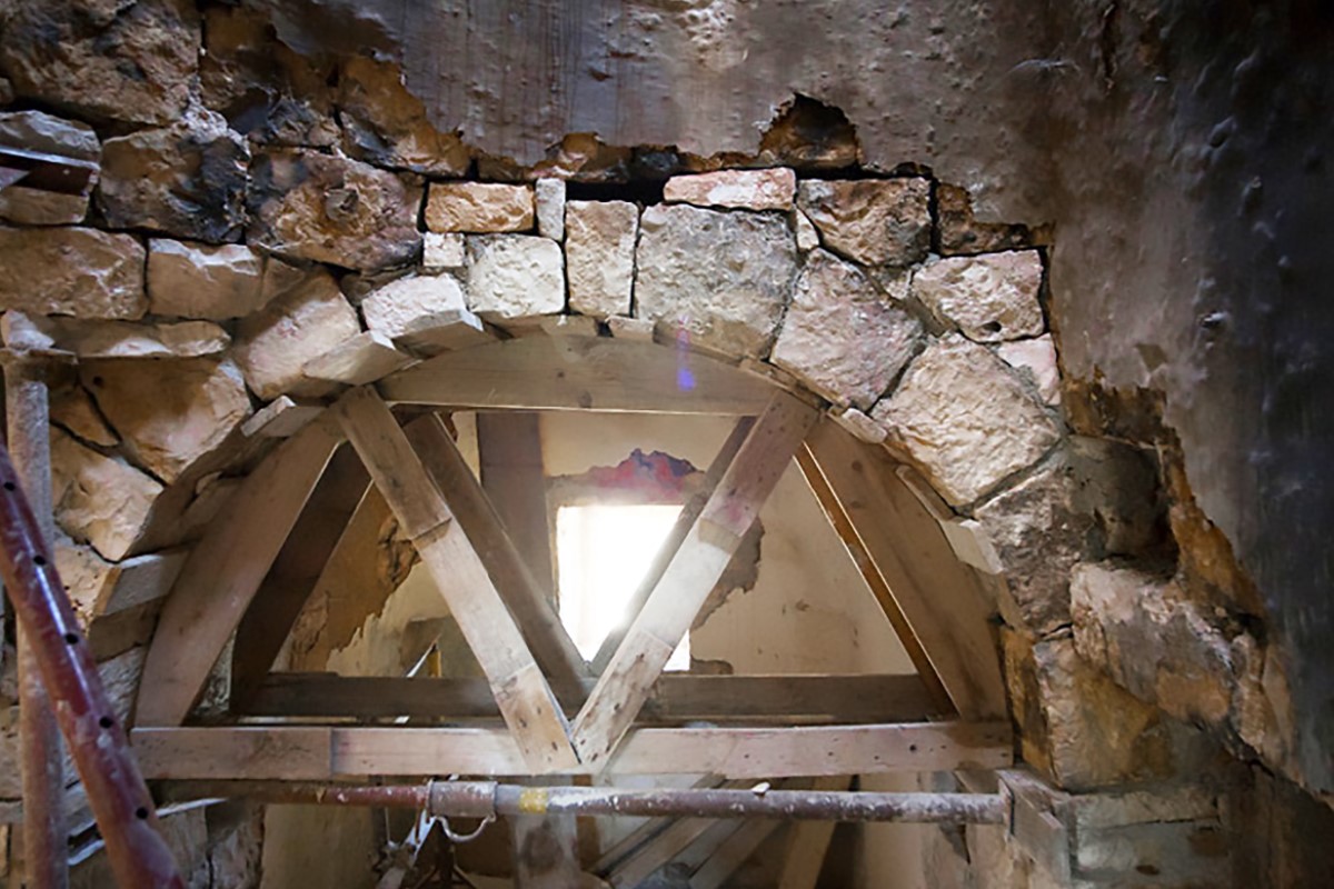 Sono stati rimossi i blocchi di pietra decoesi, le parti prossime al distacco o friabili e tutto ciò che potesse compromettere l’adesione della malta al supporto. Il supporto è stato infine accuratamente pulito mediante idropulizia, e le eventuali efflorescenze affiorate sono state spazzolate a secco. I giunti di allettamento dei nuovi conci lapidei sono stati realizzati con MALTA STRUTTURALE NHL 777 a base di calce idraulica naturale NHL 3,5 additivata con il lattice AG 15, la cui funzione è quella di migliorare l’adesione della malta al supporto.