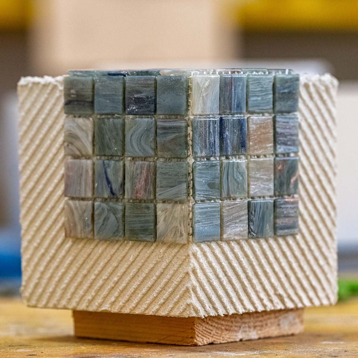 A completare l’opera, una sequenza di cubi decorati con finiture, texture e granulometrie diverse che invitano il visitatore a un gesto semplice e primordiale: toccare.