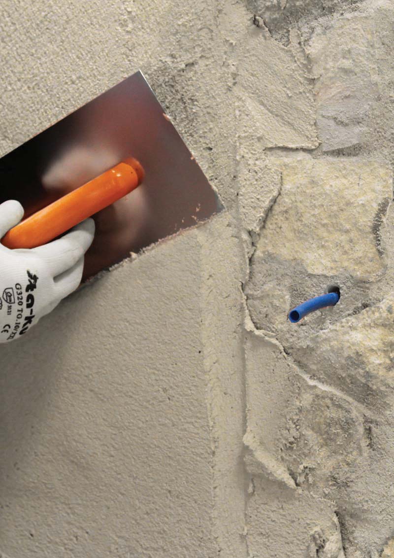 Sistema di rinforzo CRM per elementi strutturali in muratura composto da una rete e da elementi angolari in fibra di vetro AR, da connettori preformati a forma di L e da specifiche malte fibrorinforzate