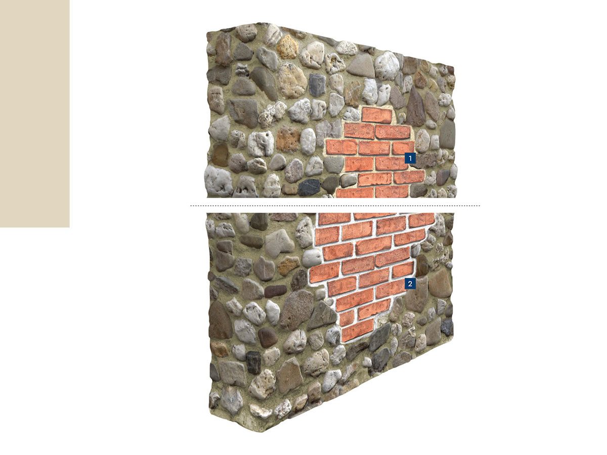 Soluzioni per il risanamento di murature connotate da giunti di allettamento degradati, discontinuità murarie o fessurazioni.