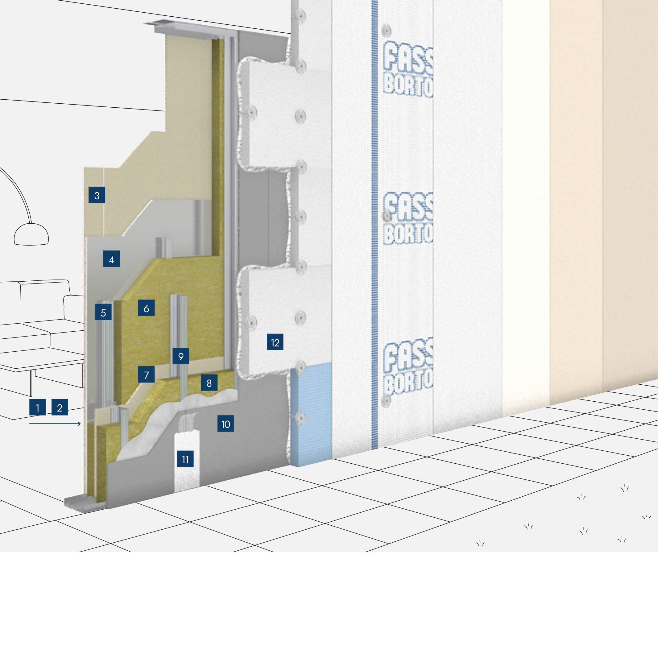 Per chiusure d’ambito Tipo SB/SC sostituire il cappotto in EPS con uno in LANA DI ROCCIA ed inserire n°1 Lastra Gypsotech FOCUS BA 13 sotto la lastra Externa Light